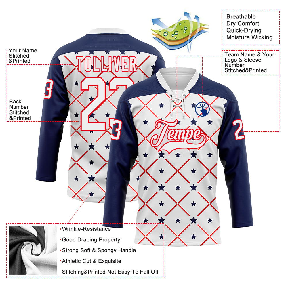 Custom White Navy-Fire Red American Flag Hockey Lace Neck Jersey