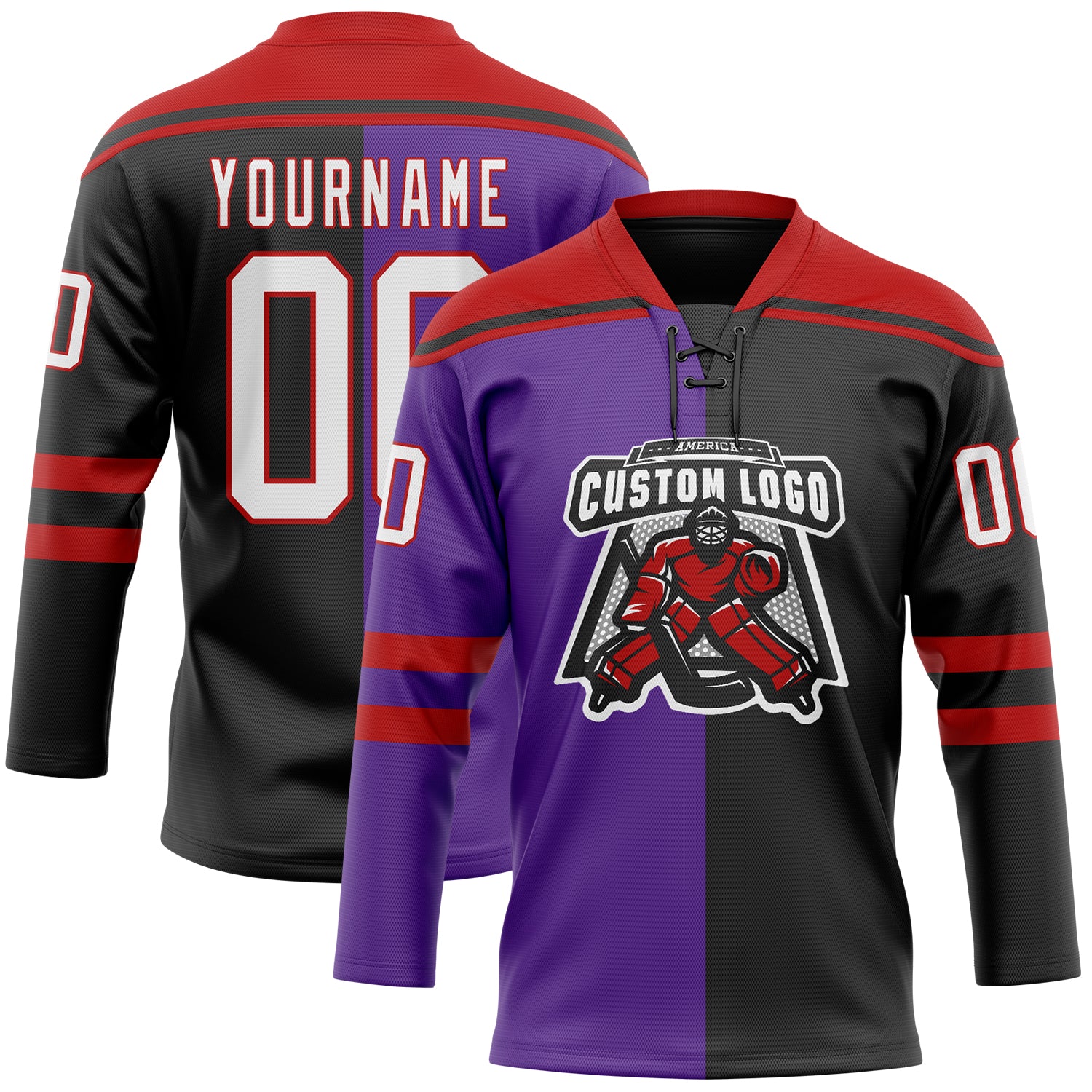 Custom Black White Purple-Red Split Fashion Hockey Lace Neck Jersey