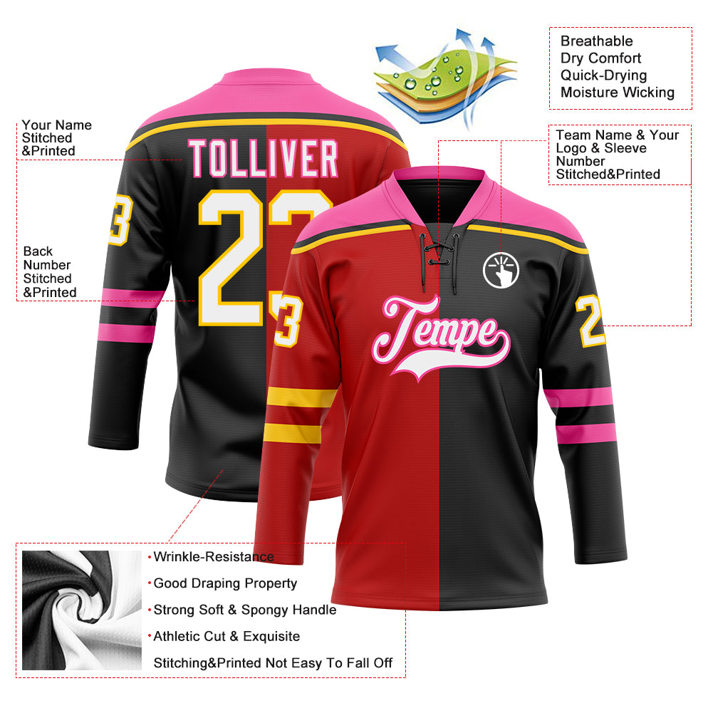 Custom Black White Red Pink-Yellow Split Fashion Hockey Lace Neck Jersey
