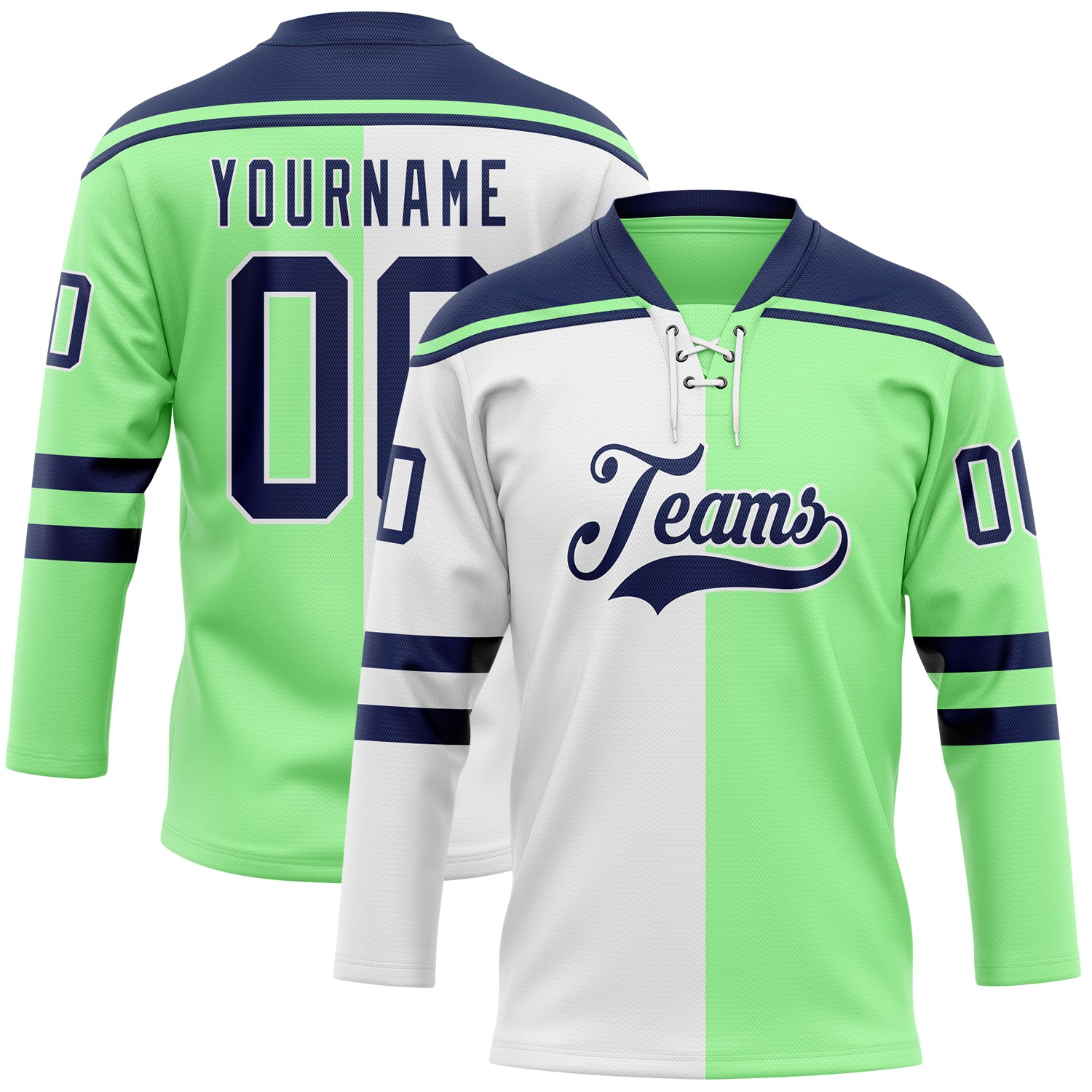 Custom Pea Green Navy-White Split Fashion Hockey Lace Neck Jersey