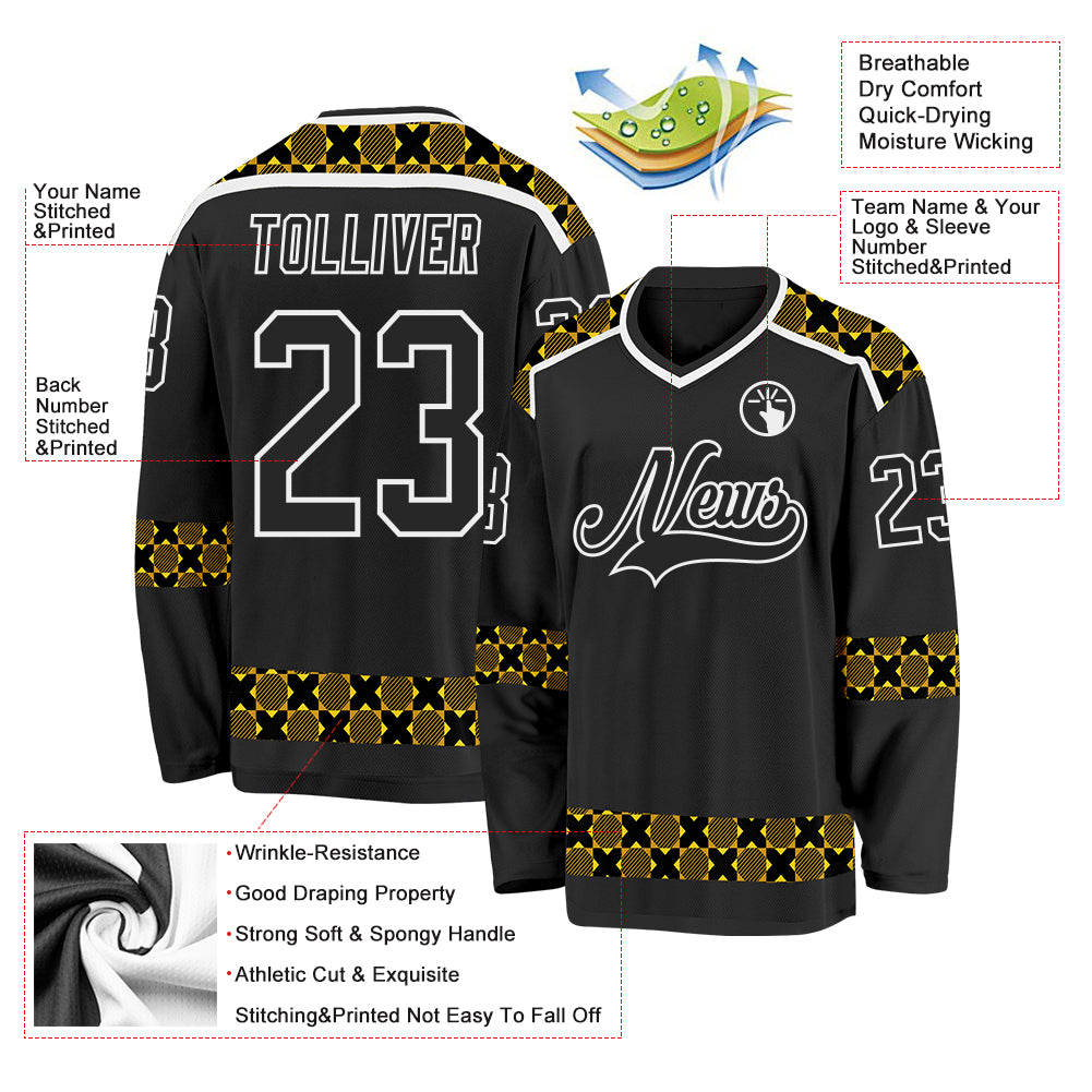 Custom Black Yellow-White 3D Pattern Plaid Hockey Jersey