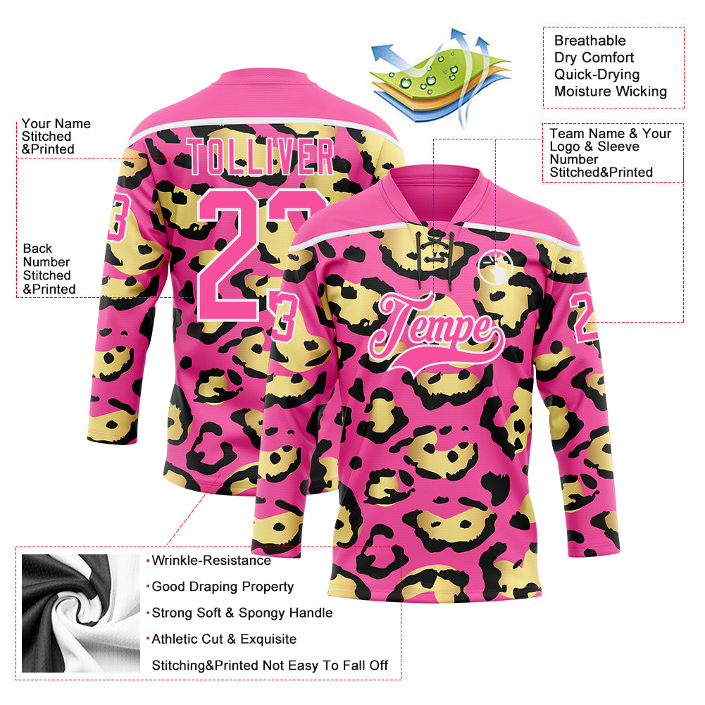 Custom Pink Yellow Black-White 3D Pattern Leopard Print Hockey Lace Neck Jersey