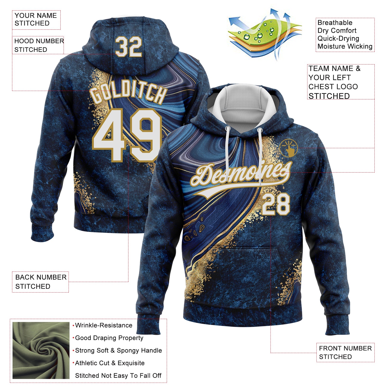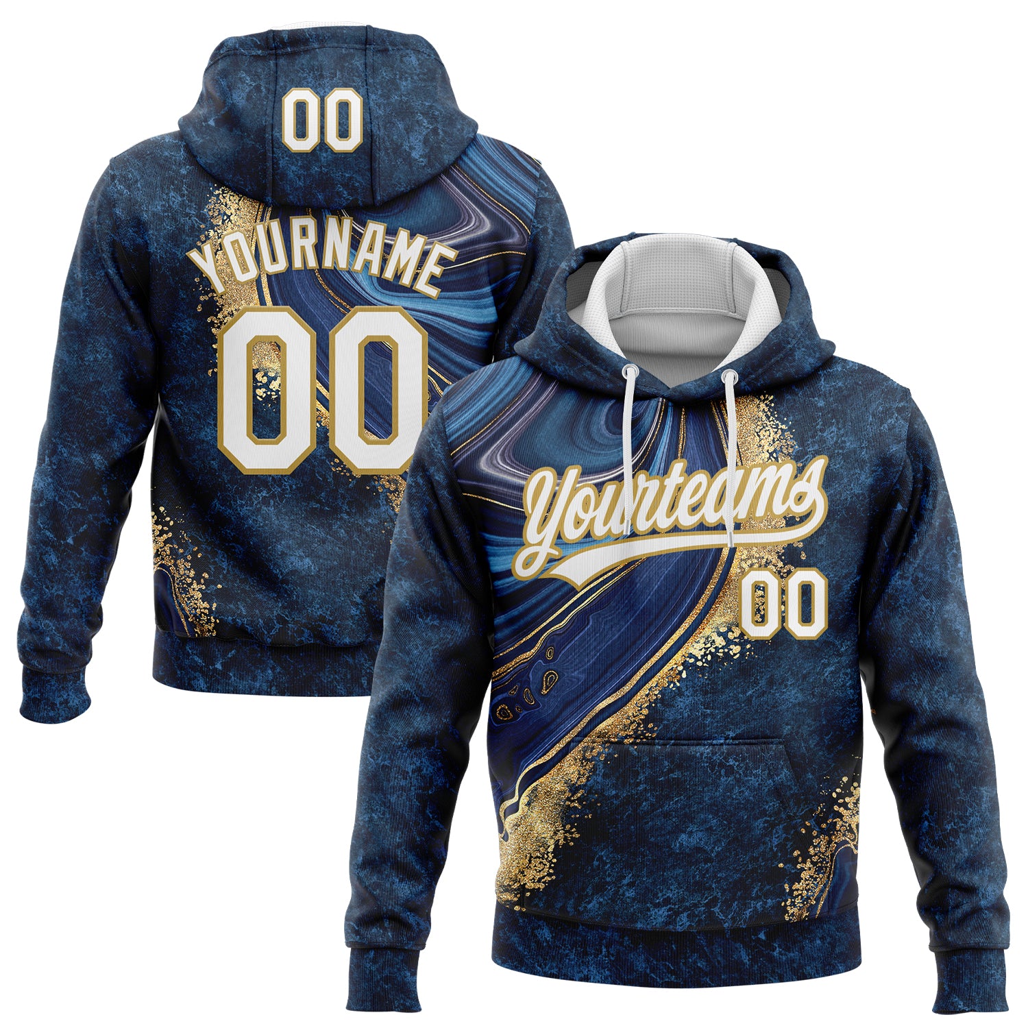 Custom Stitched Navy White-Old Gold 3D Pattern Design Abstract Marble Sports Pullover Sweatshirt Hoodie