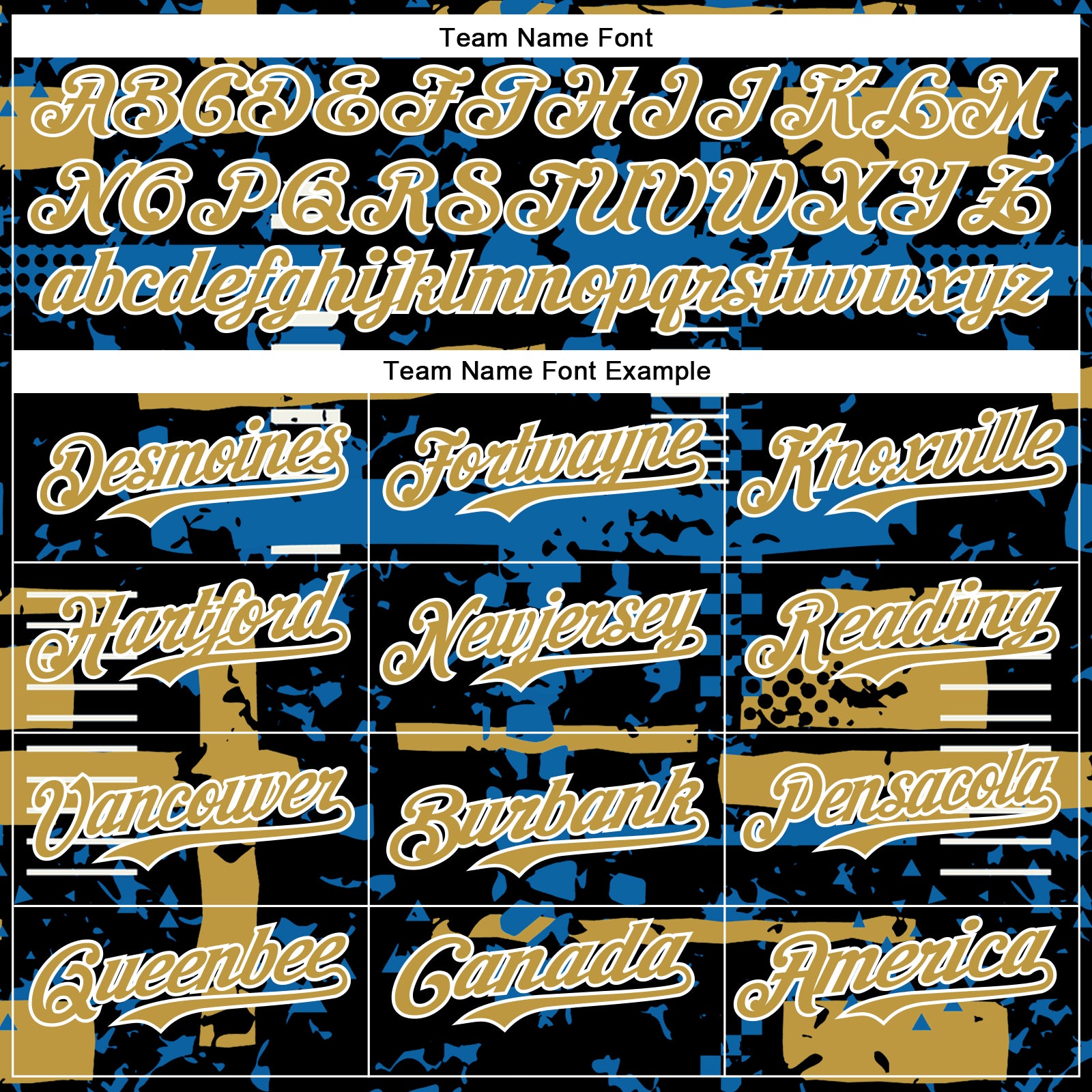 Custom Black Old Gold Blue-White Abstract Fragment Shape 3D Pattern Design Bomber Full-Snap Varsity Letterman Hoodie Jacket