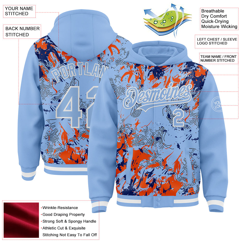 Custom Light Blue Royal Orange-White Splash 3D Pattern Design Bomber Full-Snap Varsity Letterman Hoodie Jacket