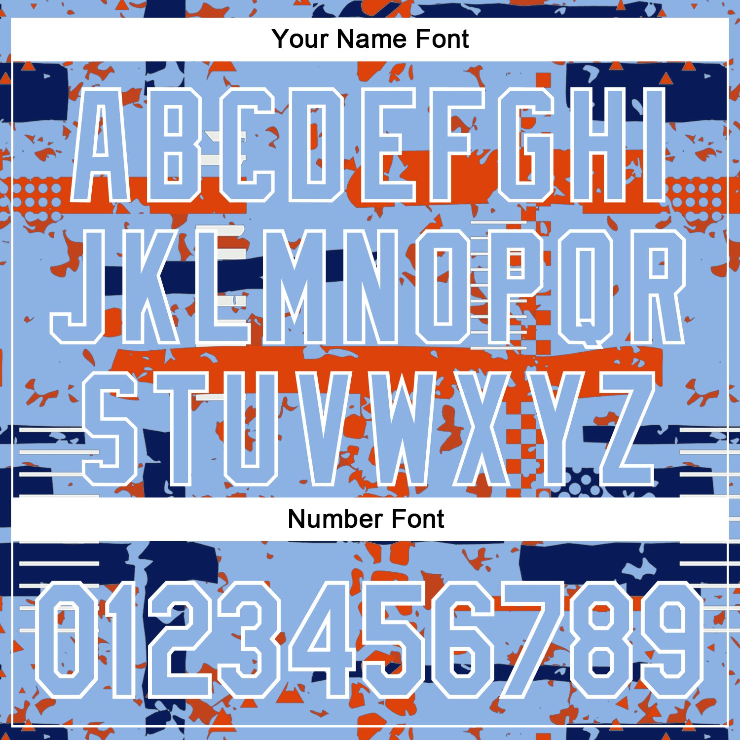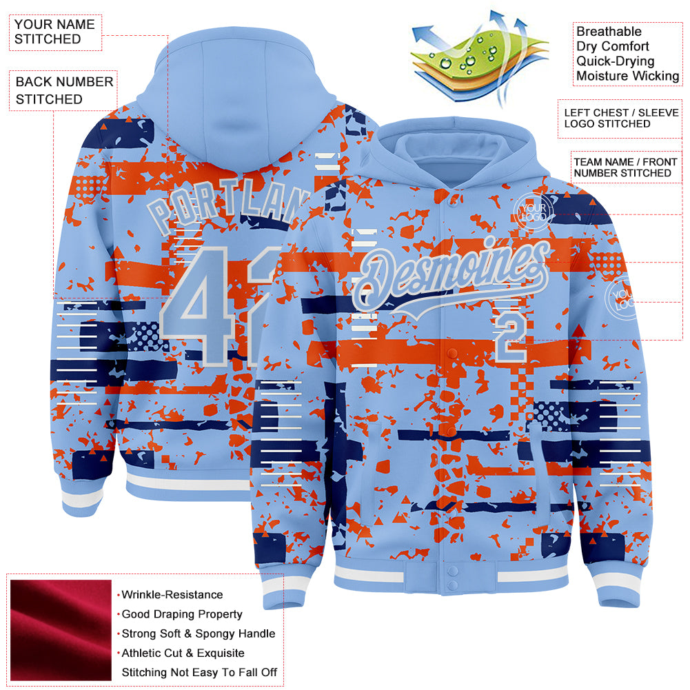 Custom Light Blue Royal Orange-White Abstract Fragment Shape 3D Pattern Design Bomber Full-Snap Varsity Letterman Hoodie Jacket
