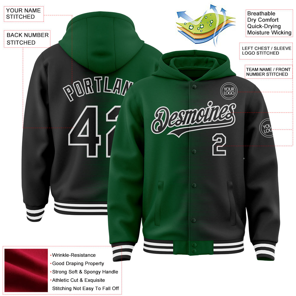 Custom Green Black-White Gradient Line Bomber Full-Snap Varsity Letterman Hoodie Jacket