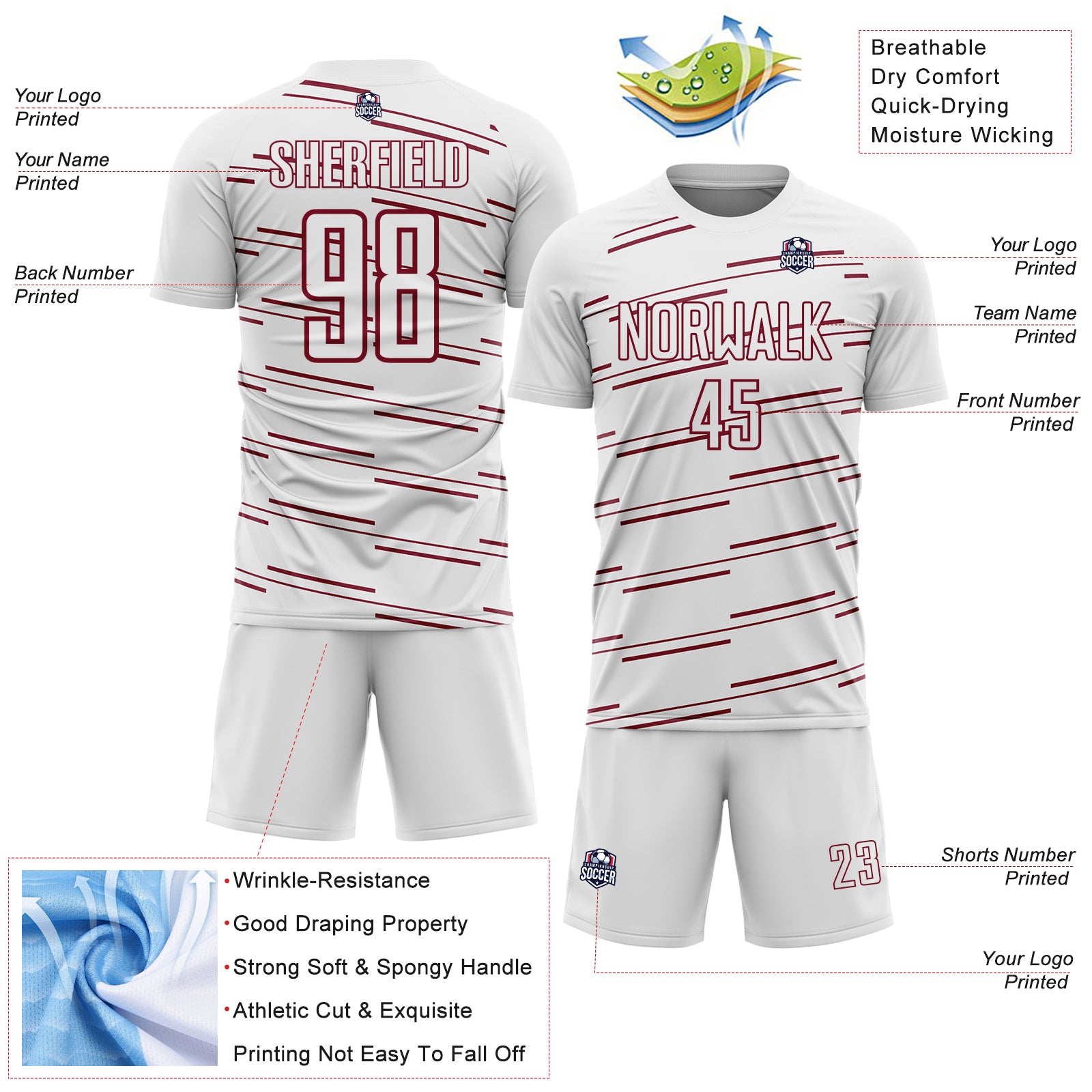 Custom White Crimson Diagonal Pinstripes Lines Sports Sublimation Soccer Uniform Jersey