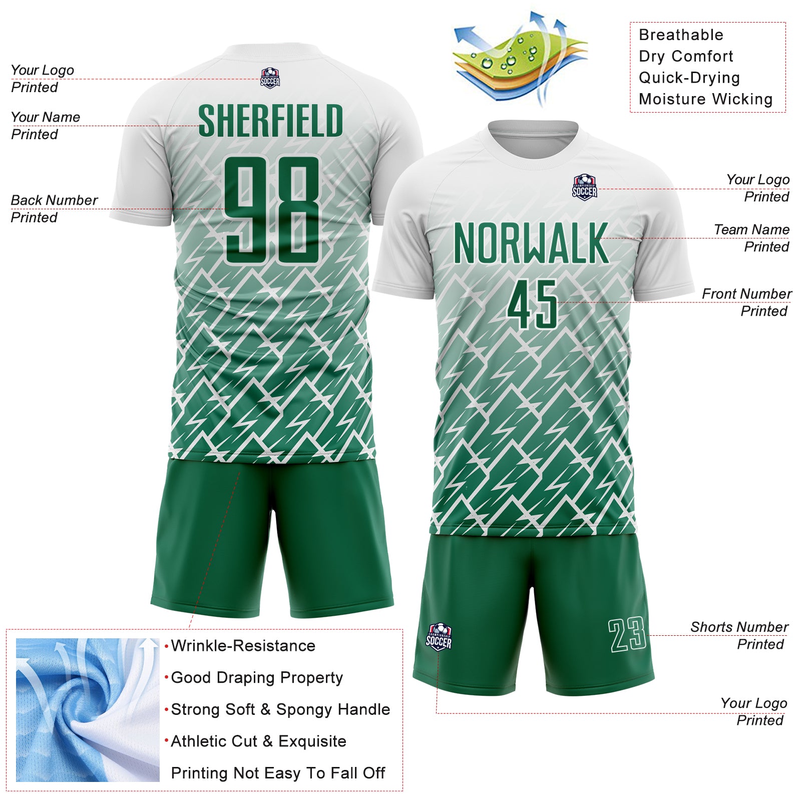 Custom White Kelly Green Lightning Sports Sublimation Soccer Uniform Jersey