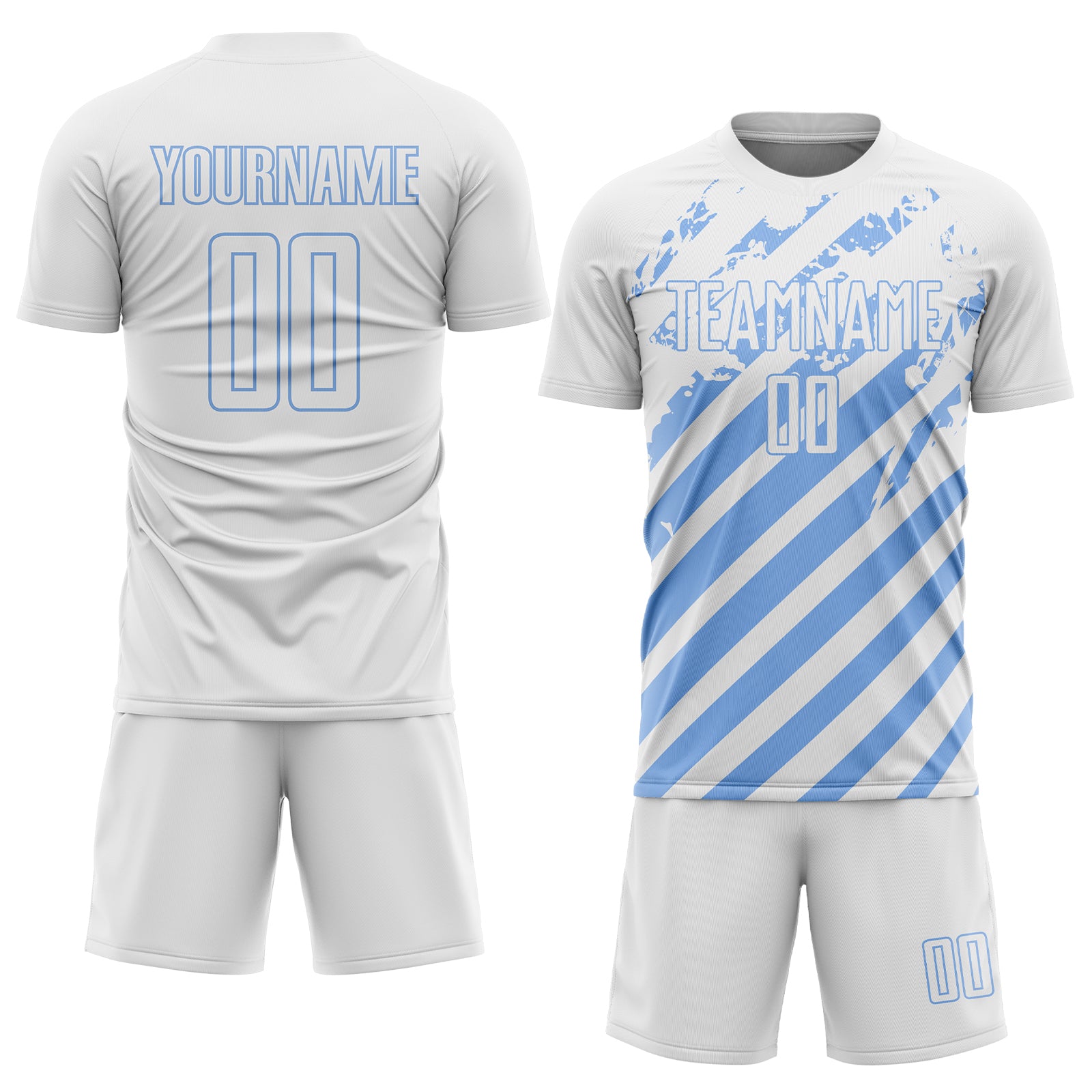 Custom White Light Blue Distressed Diagonal Stripe Pattern Sports Sublimation Soccer Uniform Jersey