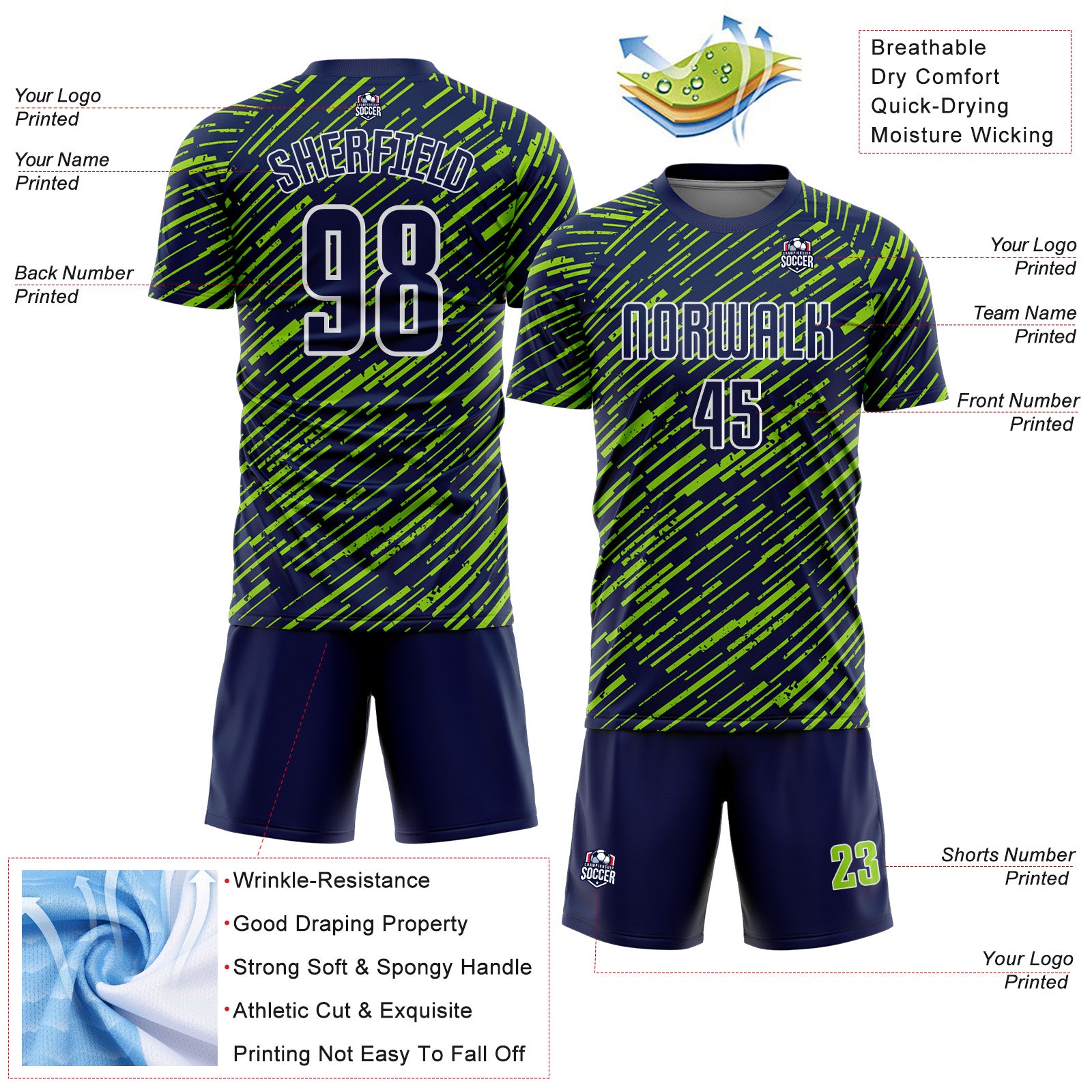 Custom Navy Neon Green-White Line Sports Sublimation Soccer Uniform Jersey