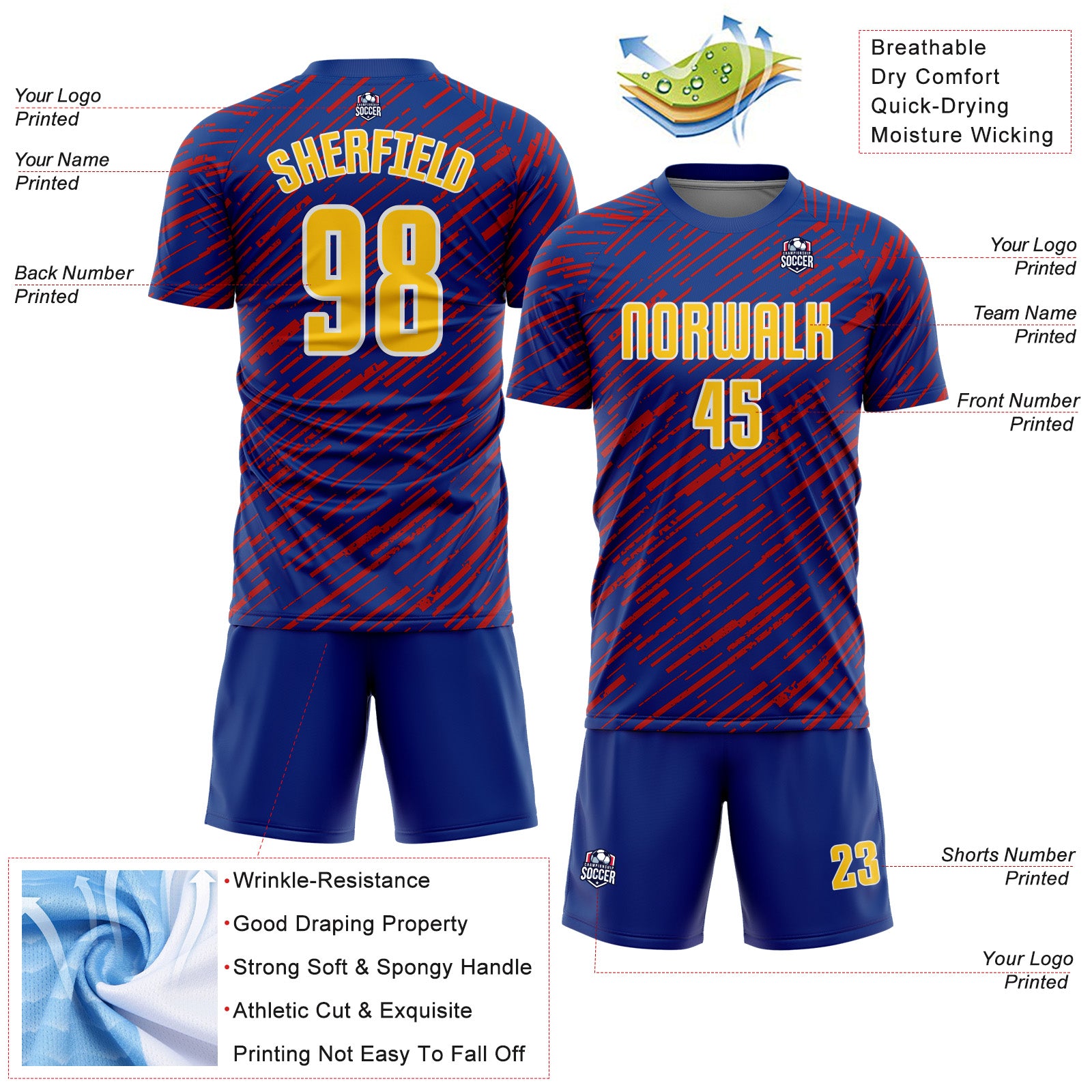 Custom Royal Yellow Red-White Line Sports Sublimation Soccer Uniform Jersey