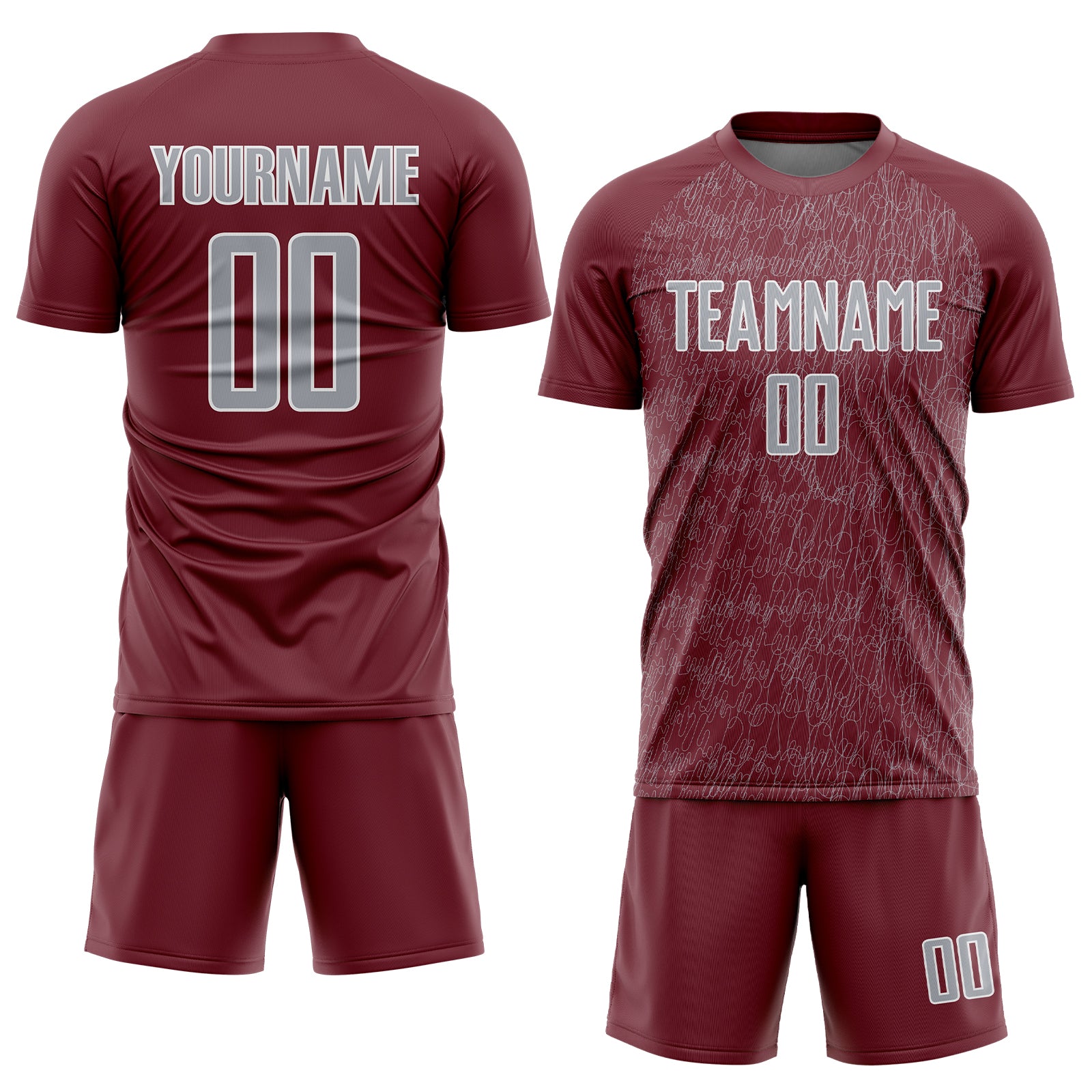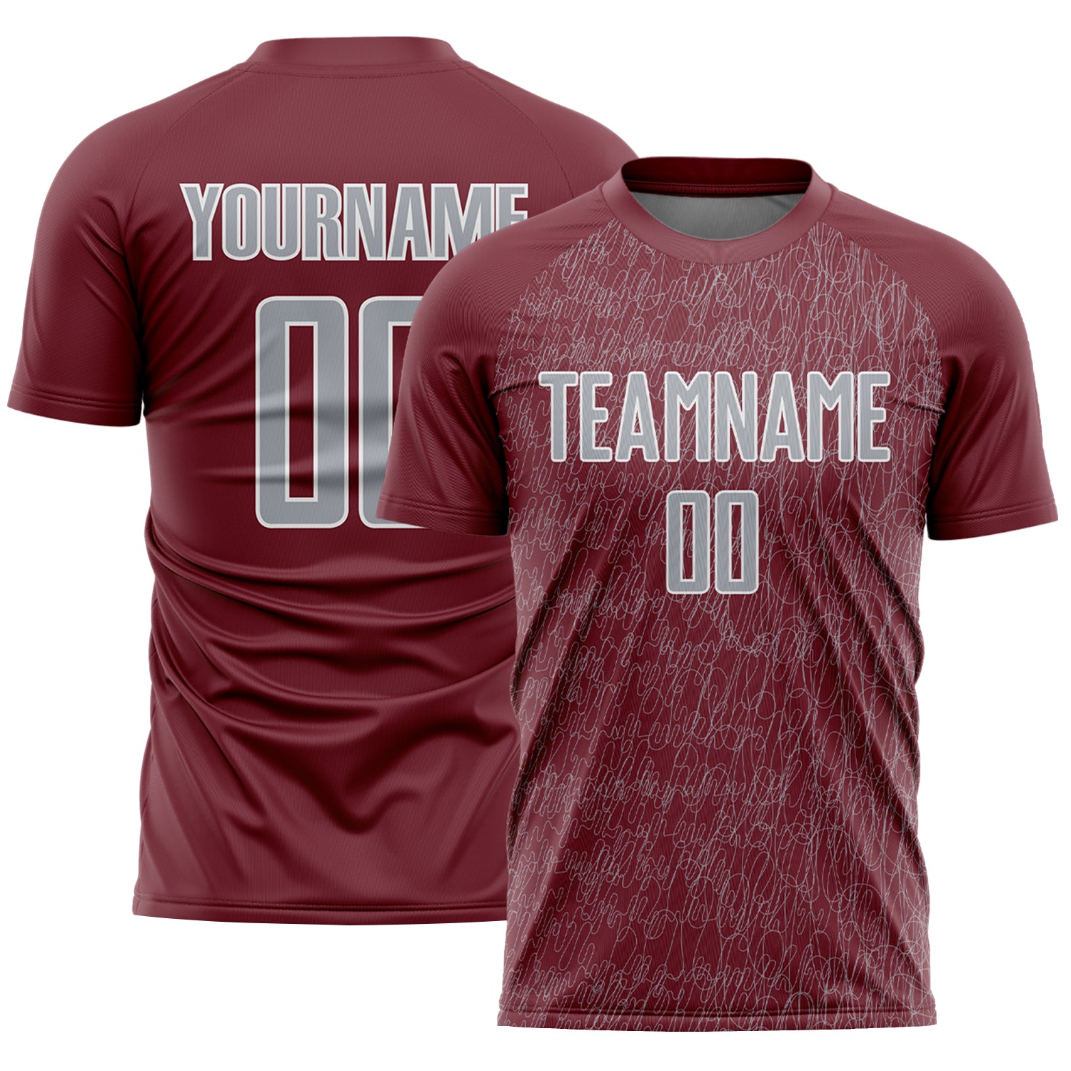Custom Burgundy Gray-White Abstract Scribble Curve Line Pattern Sports Sublimation Soccer Uniform Jersey