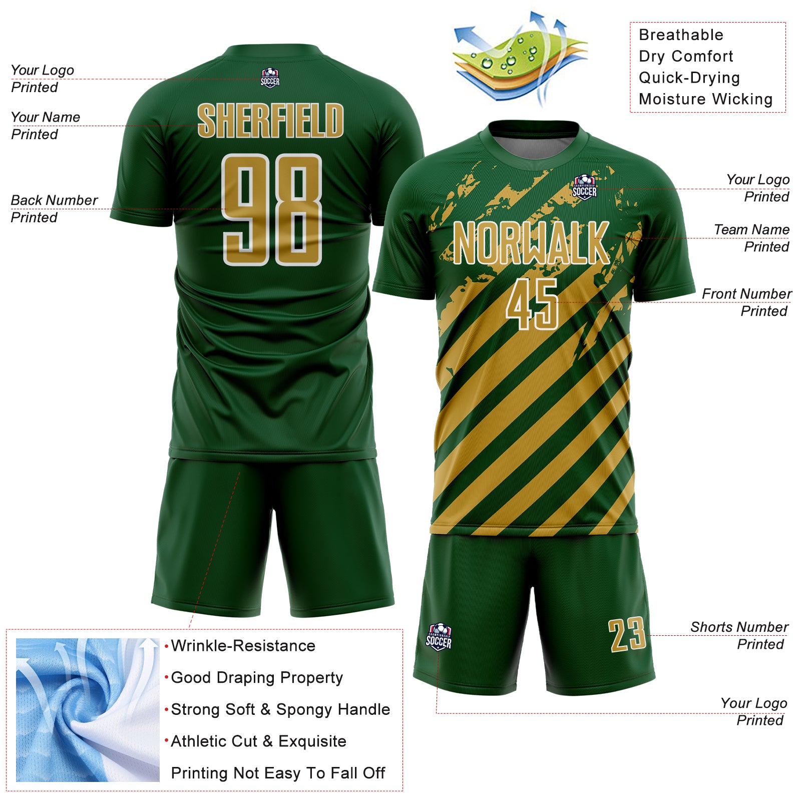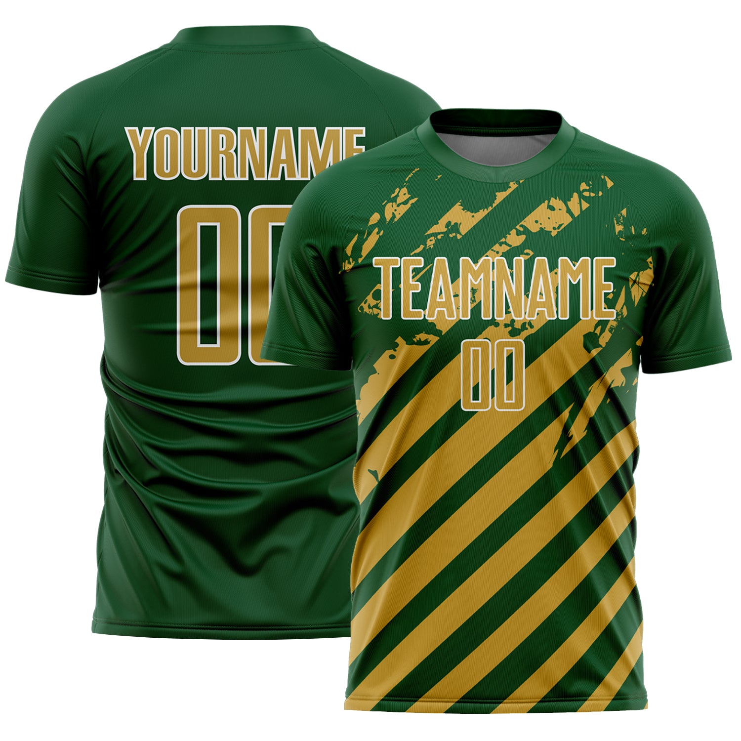 Custom Green Old Gold-White Distressed Diagonal Stripe Pattern Sports Sublimation Soccer Uniform Jersey