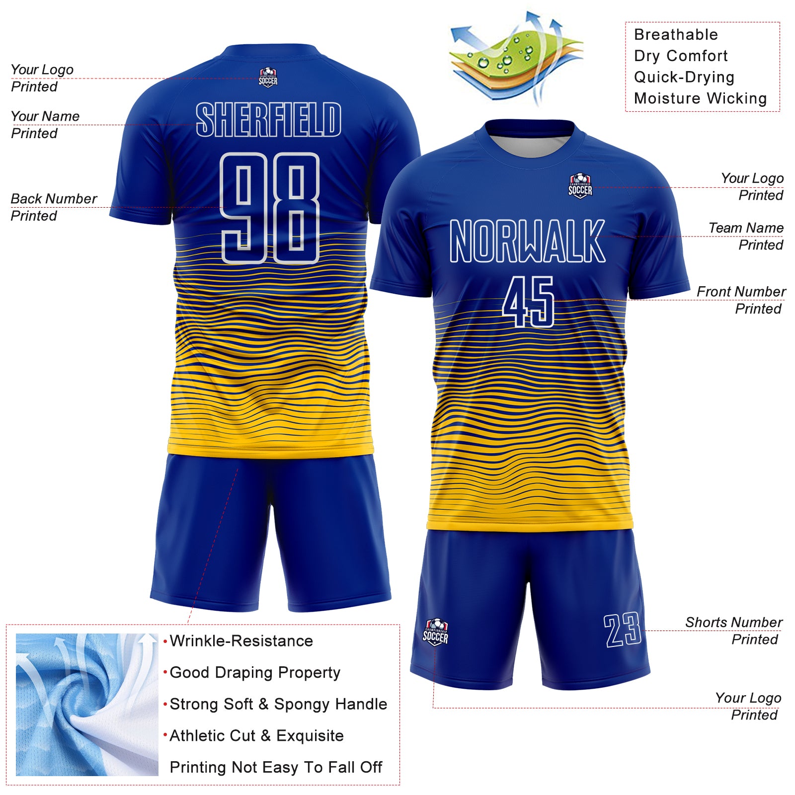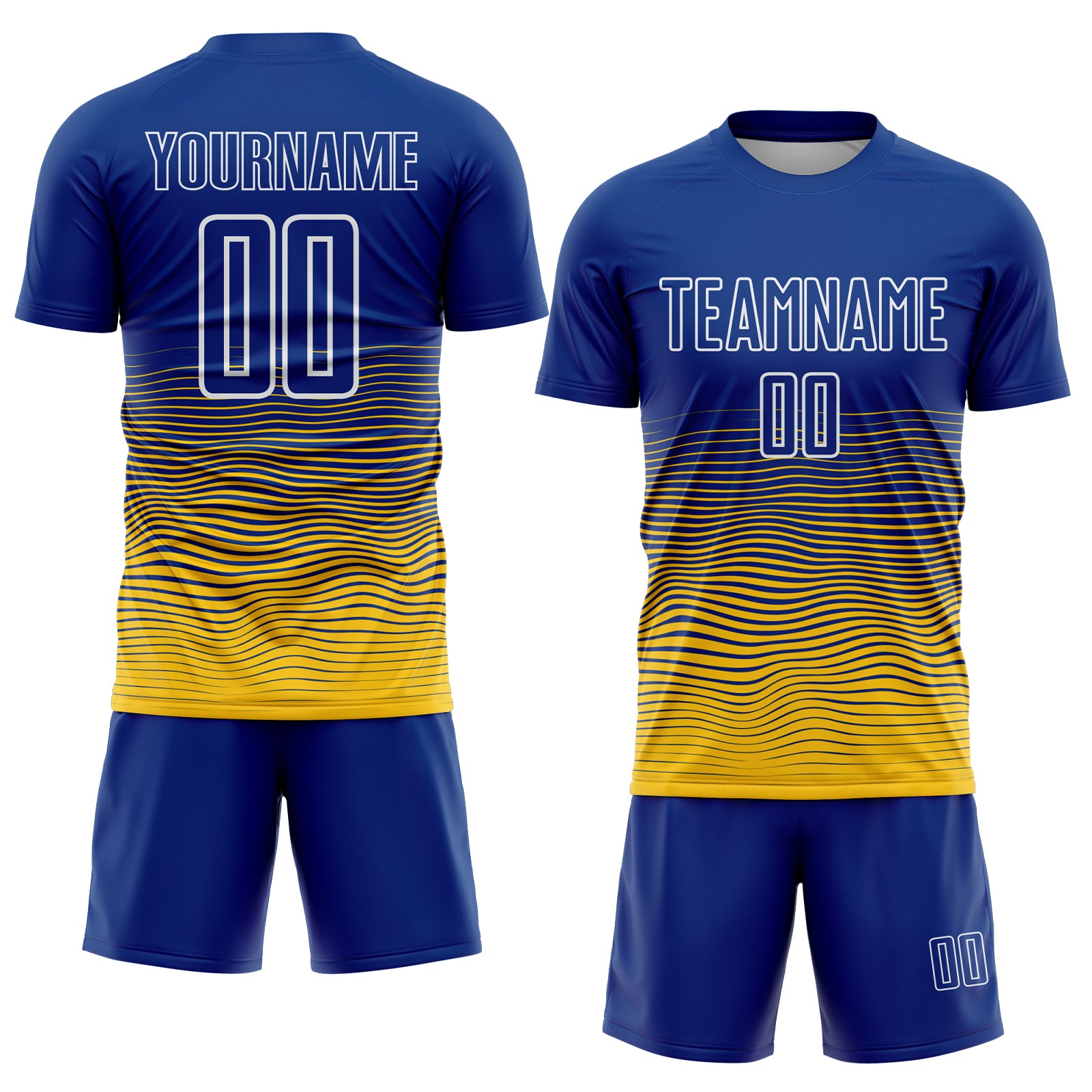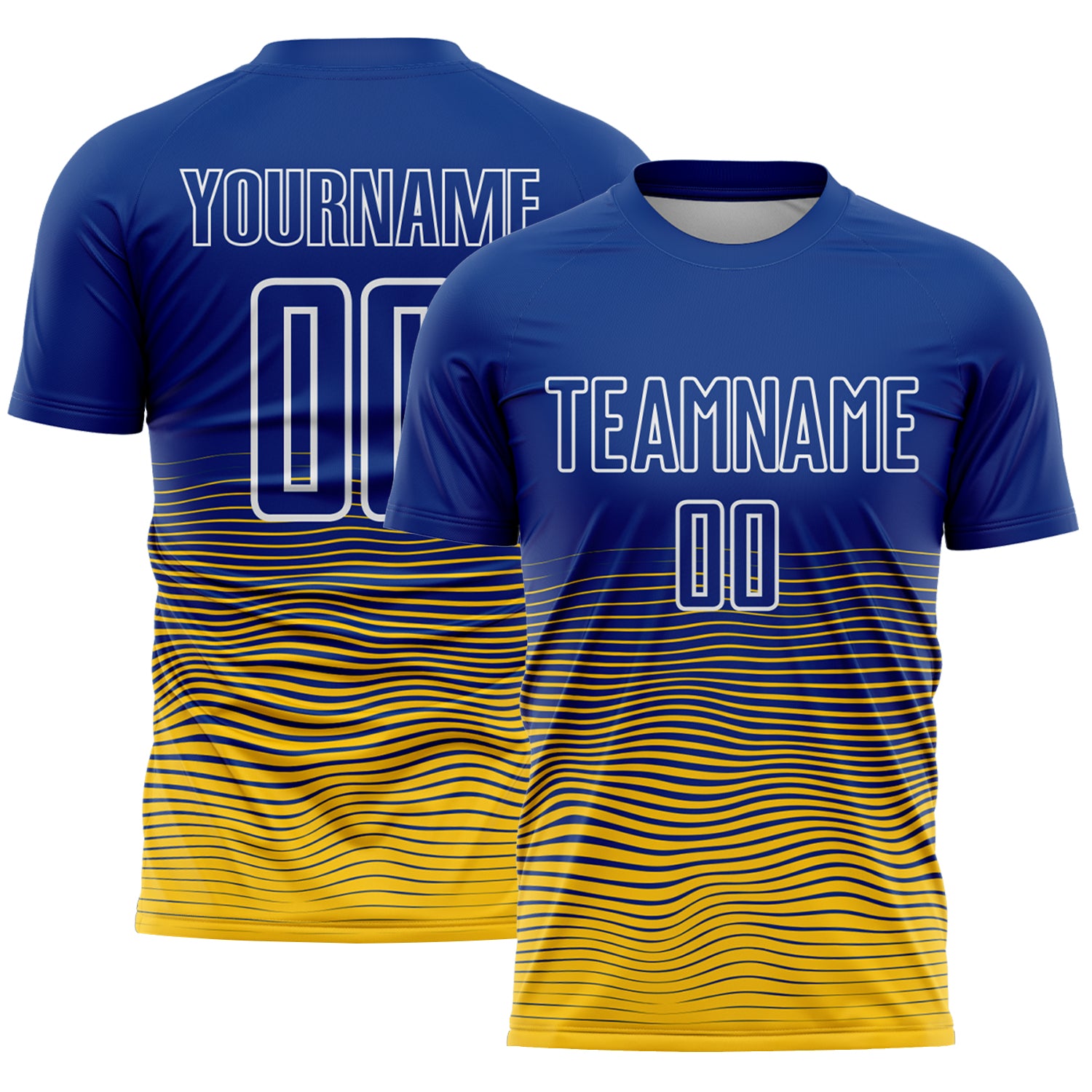 Custom Royal White-Yellow Gradient Wave Line Sports Sublimation Soccer Uniform Jersey