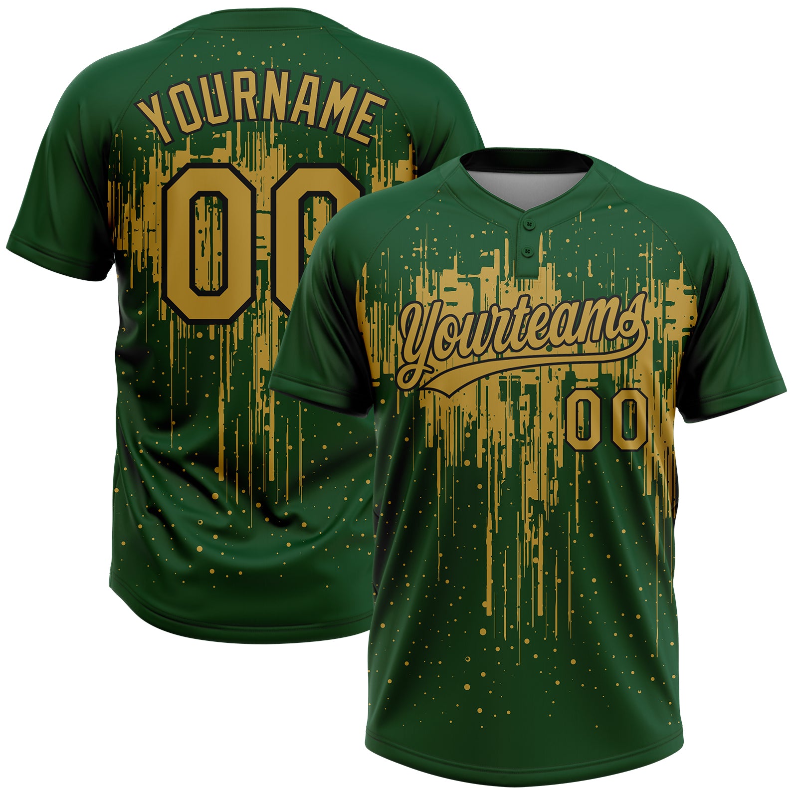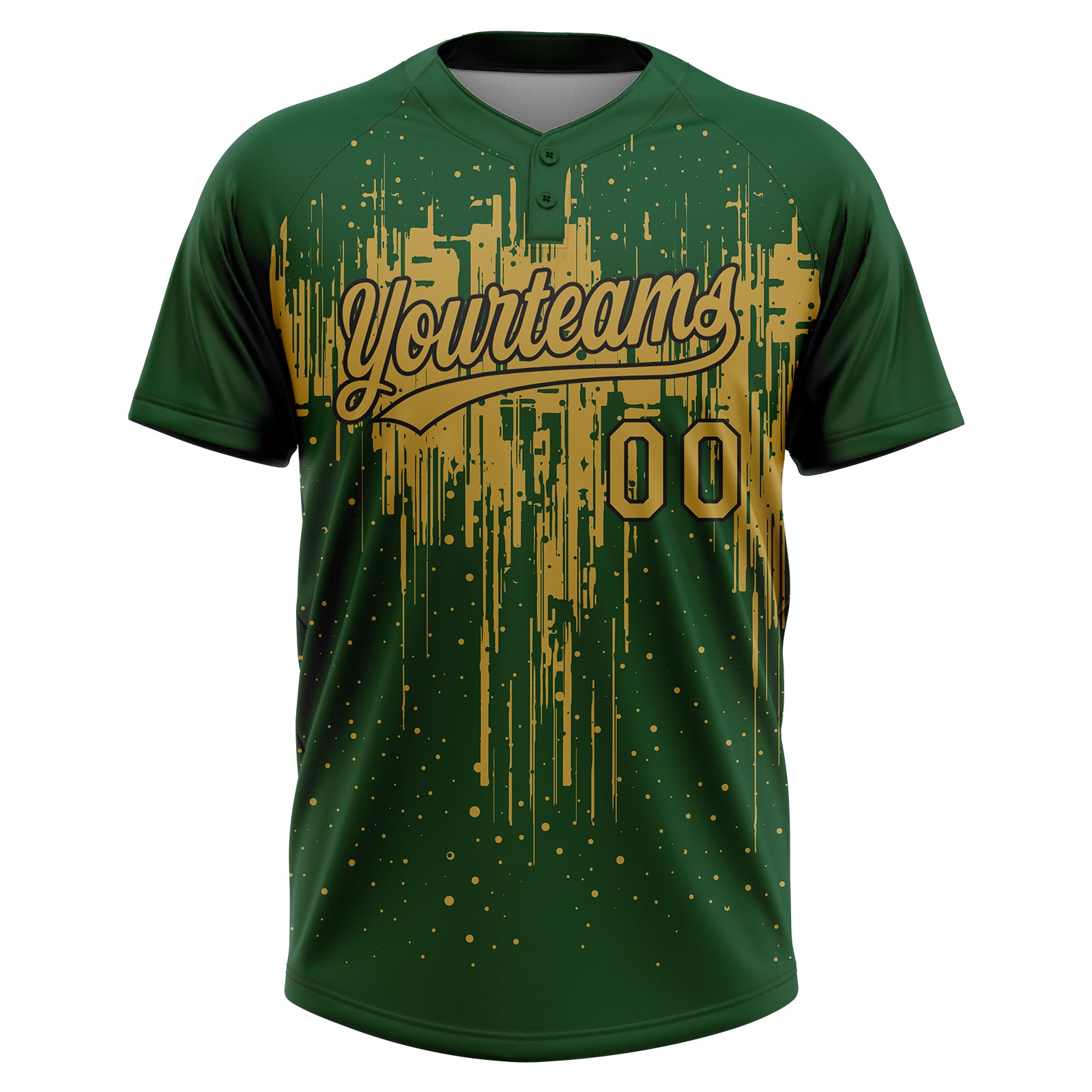 Custom Green Old Gold-Black Dripping Splatter Paint Two-Button Unisex Softball Jersey