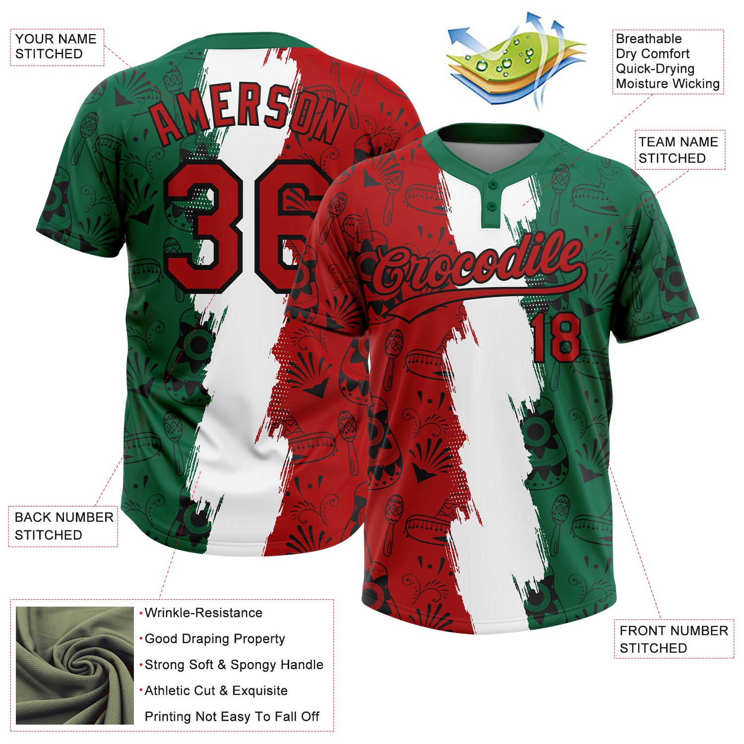 Custom Kelly Green Red Black-White Mexico Two-Button Unisex Softball Jersey