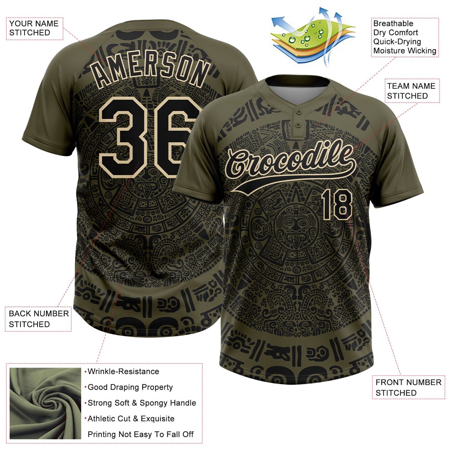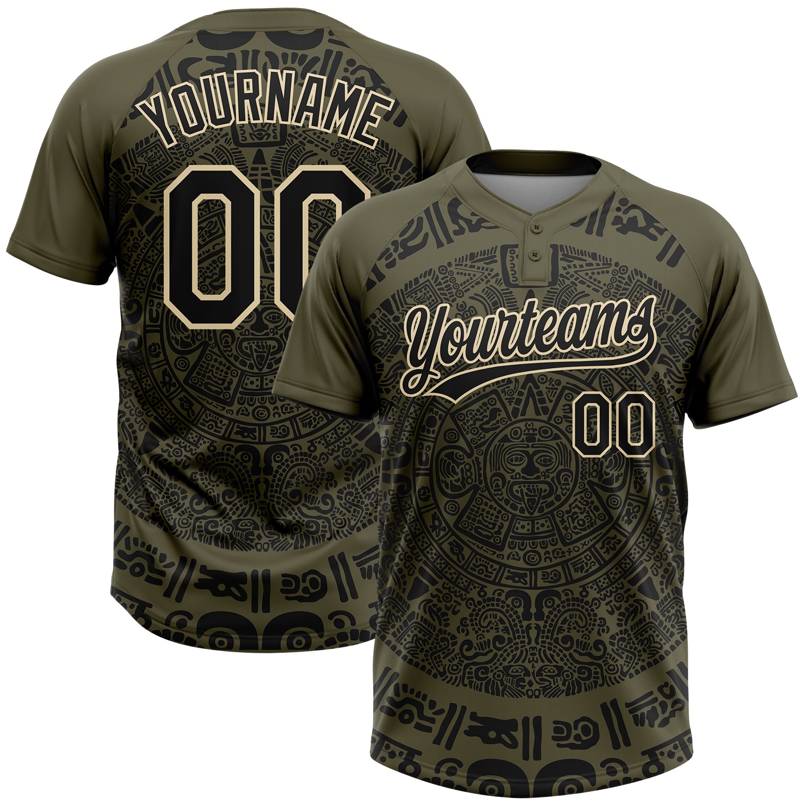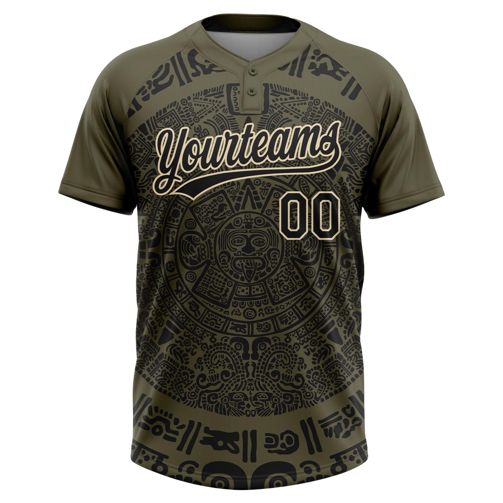 Custom Olive Black-Cream Ethnic Aztec Mexican Heritage Two-Button Unisex Softball Jersey
