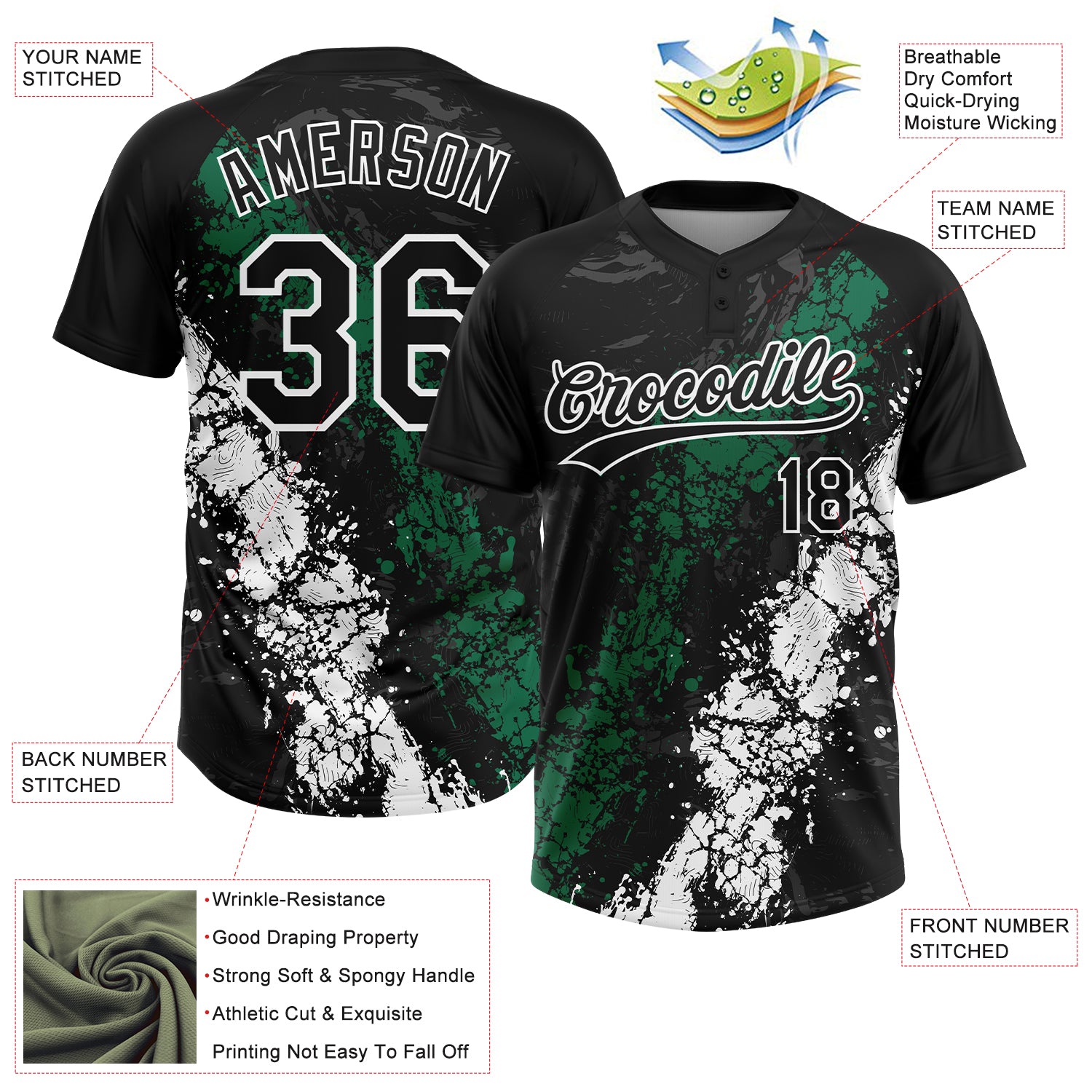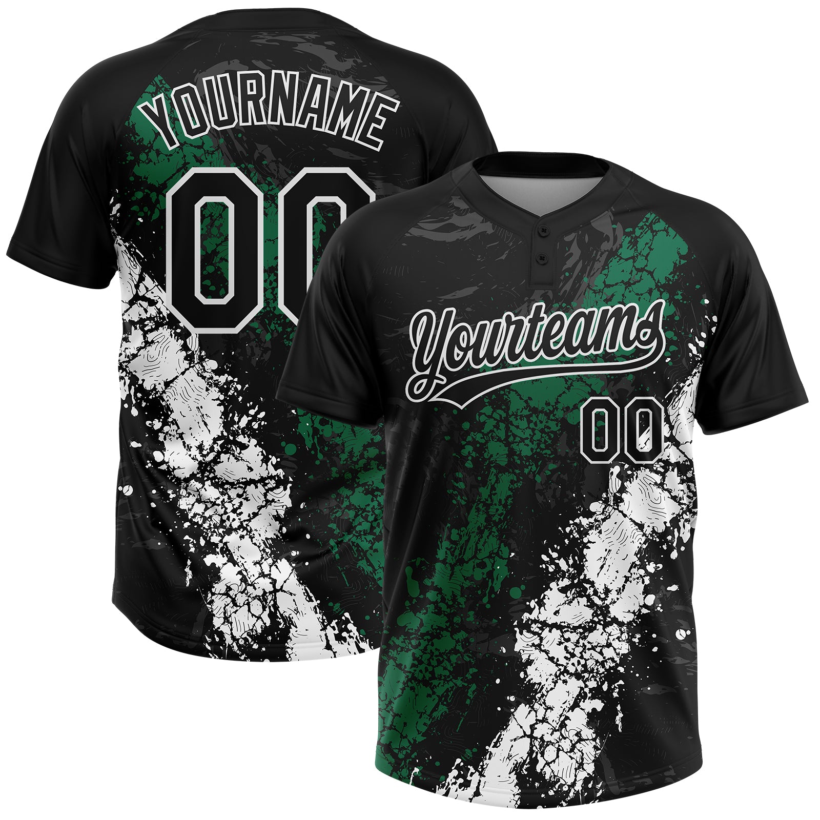 Custom Black Kelly Green-White Dripping Splatter Cracked Texture Two-Button Unisex Softball Jersey