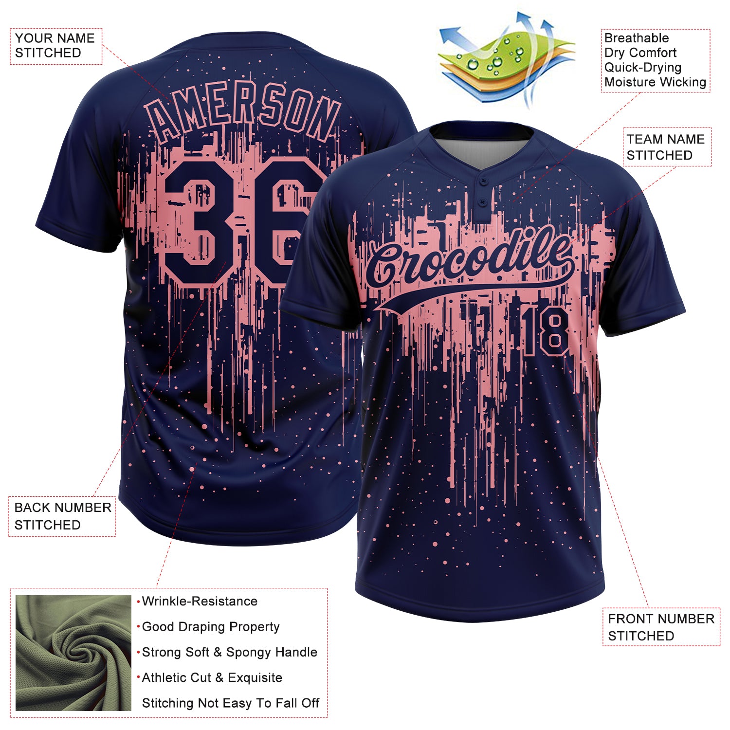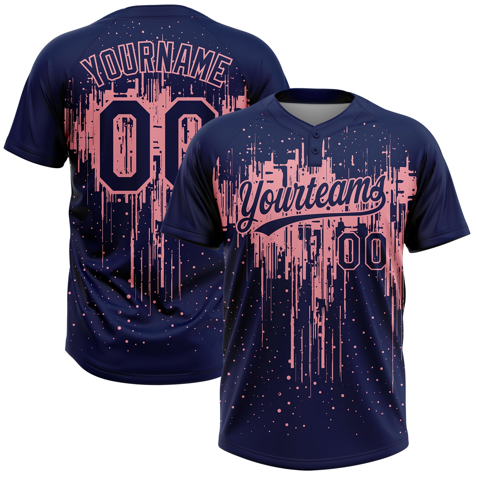 Custom Navy Medium Pink Dripping Splatter Paint Two-Button Unisex Softball Jersey