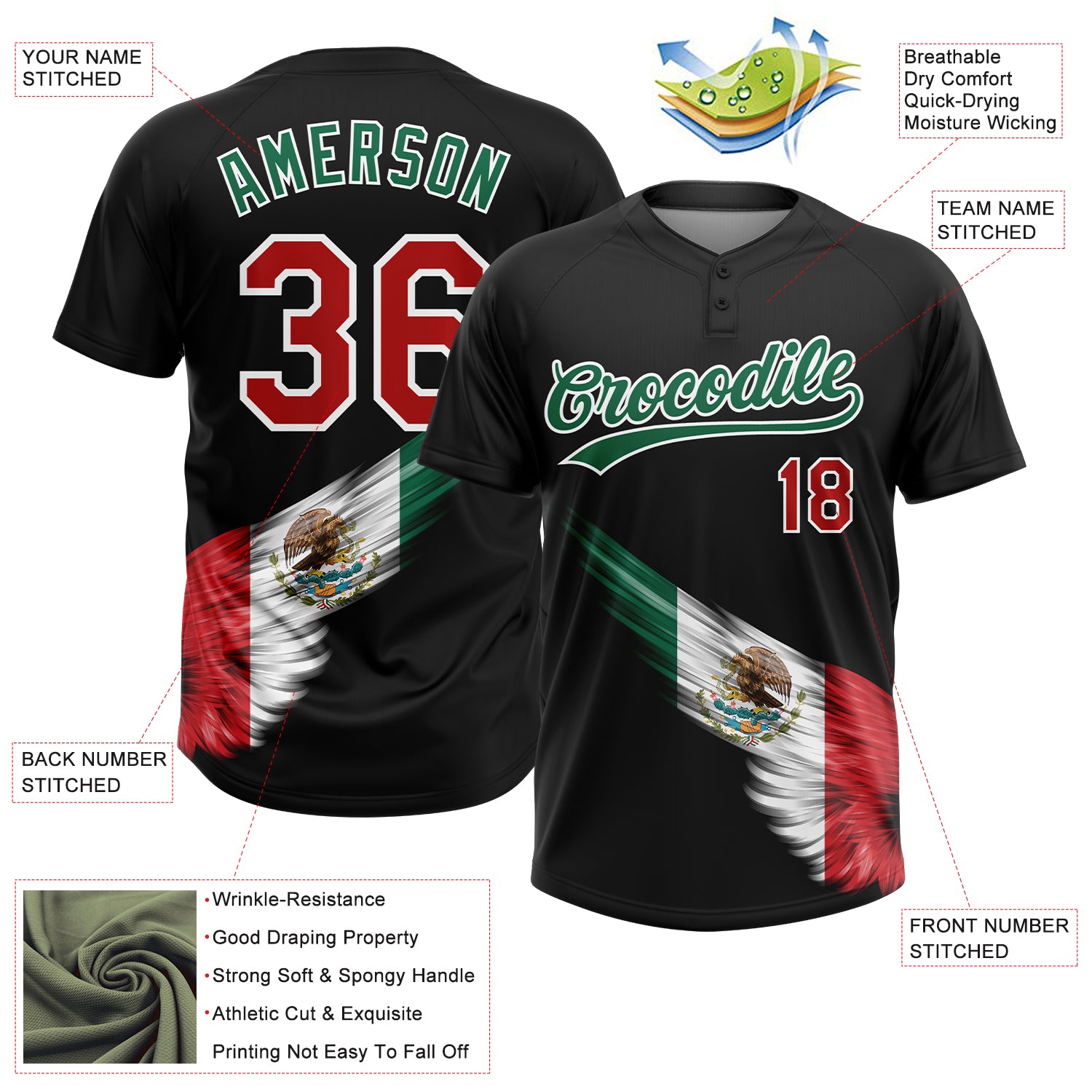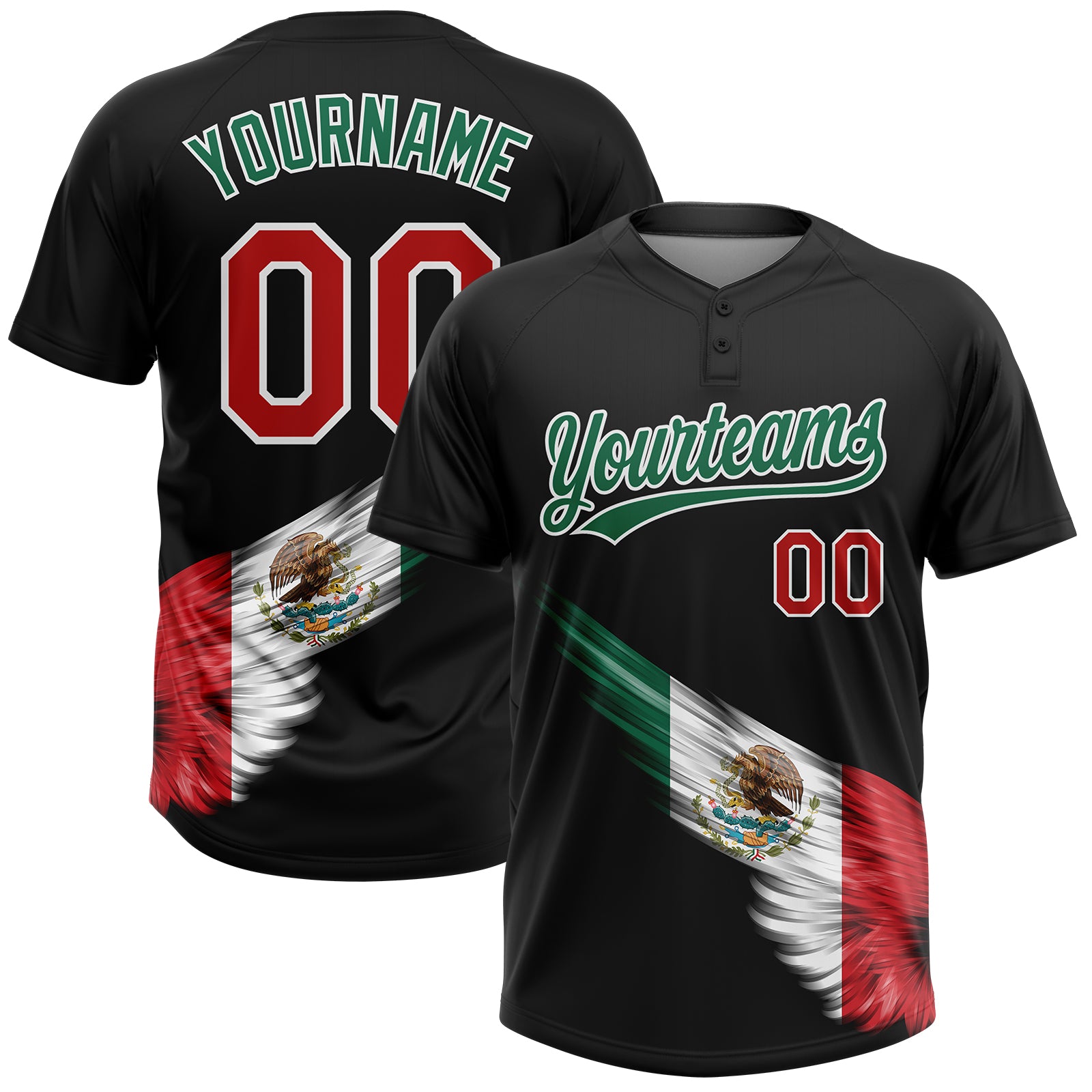 Custom Black Kelly Green Red-White The Abstract Wing With Mexican Flag Two-Button Unisex Softball Jersey
