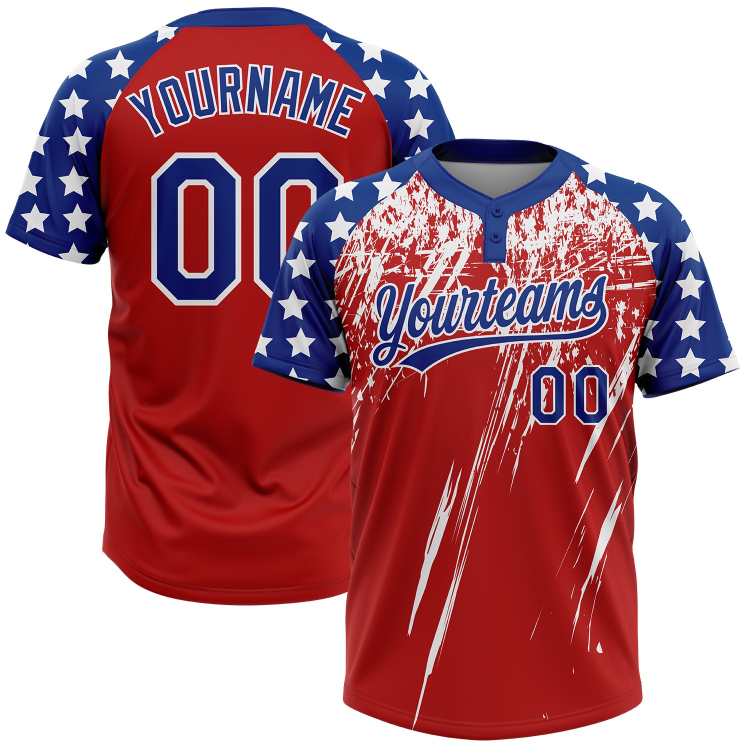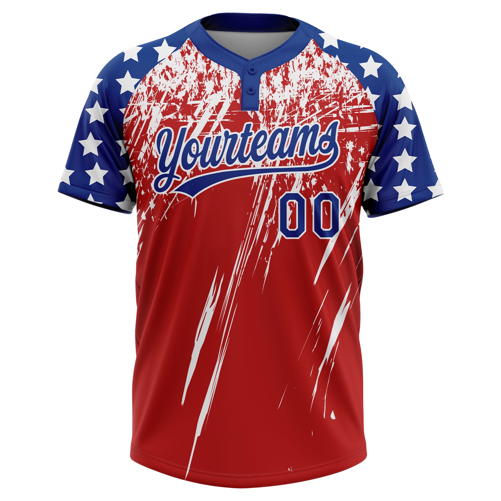 Custom Red Royal-White Distressed Scratch Brush Stroke Star Raglan Sleeves Two-Button Unisex Softball Jersey