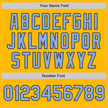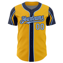 • Load image into Gallery viewer, Custom Gold Light Blue-Navy 3 Colors Arm Shapes Authentic Baseball Jersey