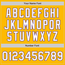 • Load image into Gallery viewer, Custom Gold White-Purple 3 Colors Arm Shapes Authentic Baseball Jersey
