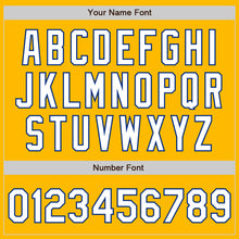 • Load image into Gallery viewer, Custom Gold White-Royal 3 Colors Arm Shapes Authentic Baseball Jersey