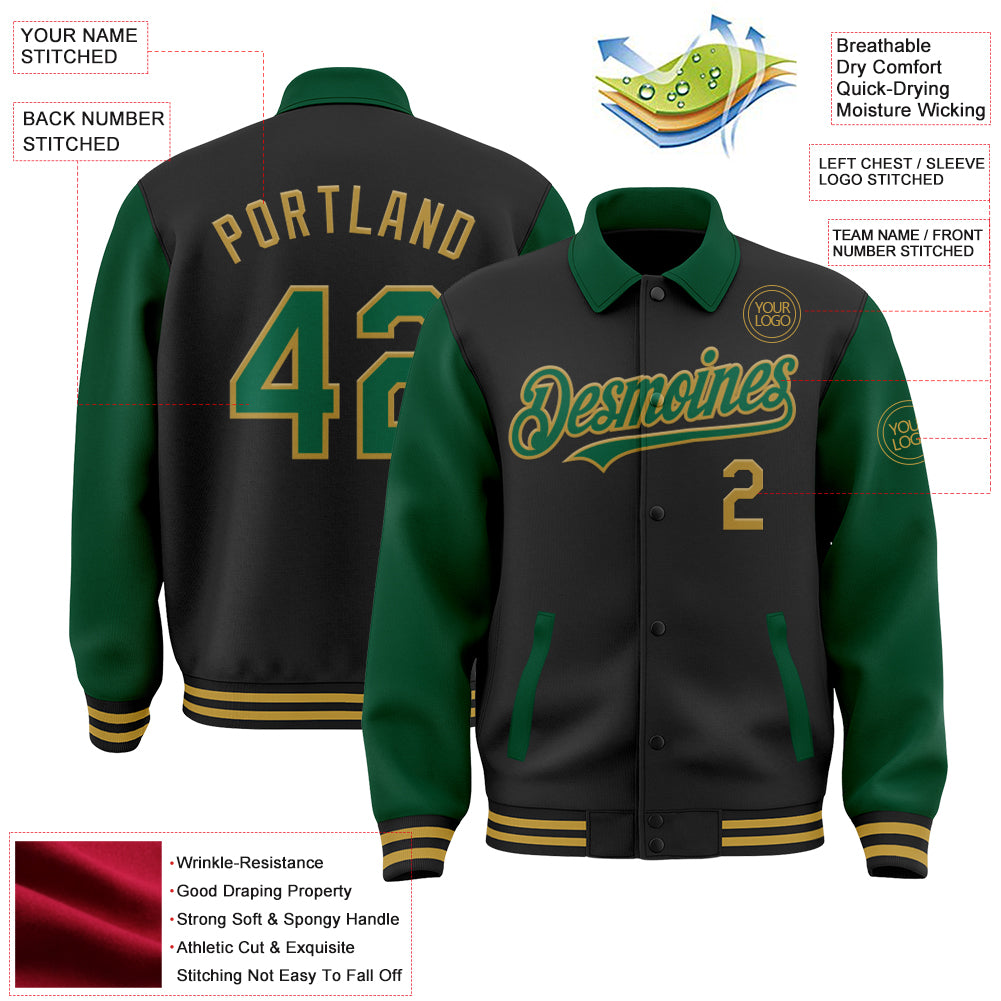 Custom Black Kelly Green-Old Gold Bomber Full-Snap Varsity Letterman Two Tone Lapel Collar Byron Jacket