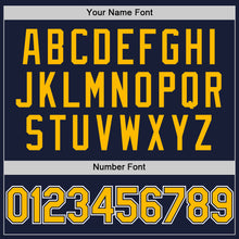 • Load image into Gallery viewer, Custom Navy Gold-White Bomber Full-Snap Varsity Letterman Two Tone Hoodie Jacket