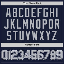 • Load image into Gallery viewer, Custom Navy Gray-White Bomber Full-Snap Varsity Letterman Two Tone Hoodie Jacket