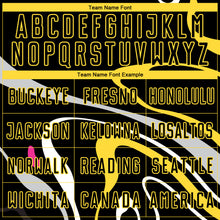• Load image into Gallery viewer, Custom Black Gold Fluid Shapes Sublimation Soccer Uniform Jersey