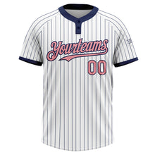 • Load image into Gallery viewer, Custom White Navy Pinstripe Medium Pink Two-Button Unisex Softball Jersey