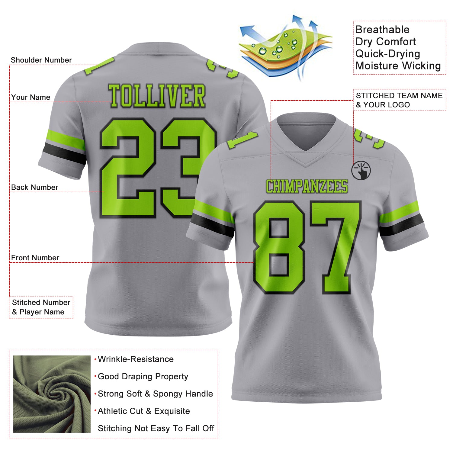 Custom Gray Neon Green-Black Authentic Football Jersey