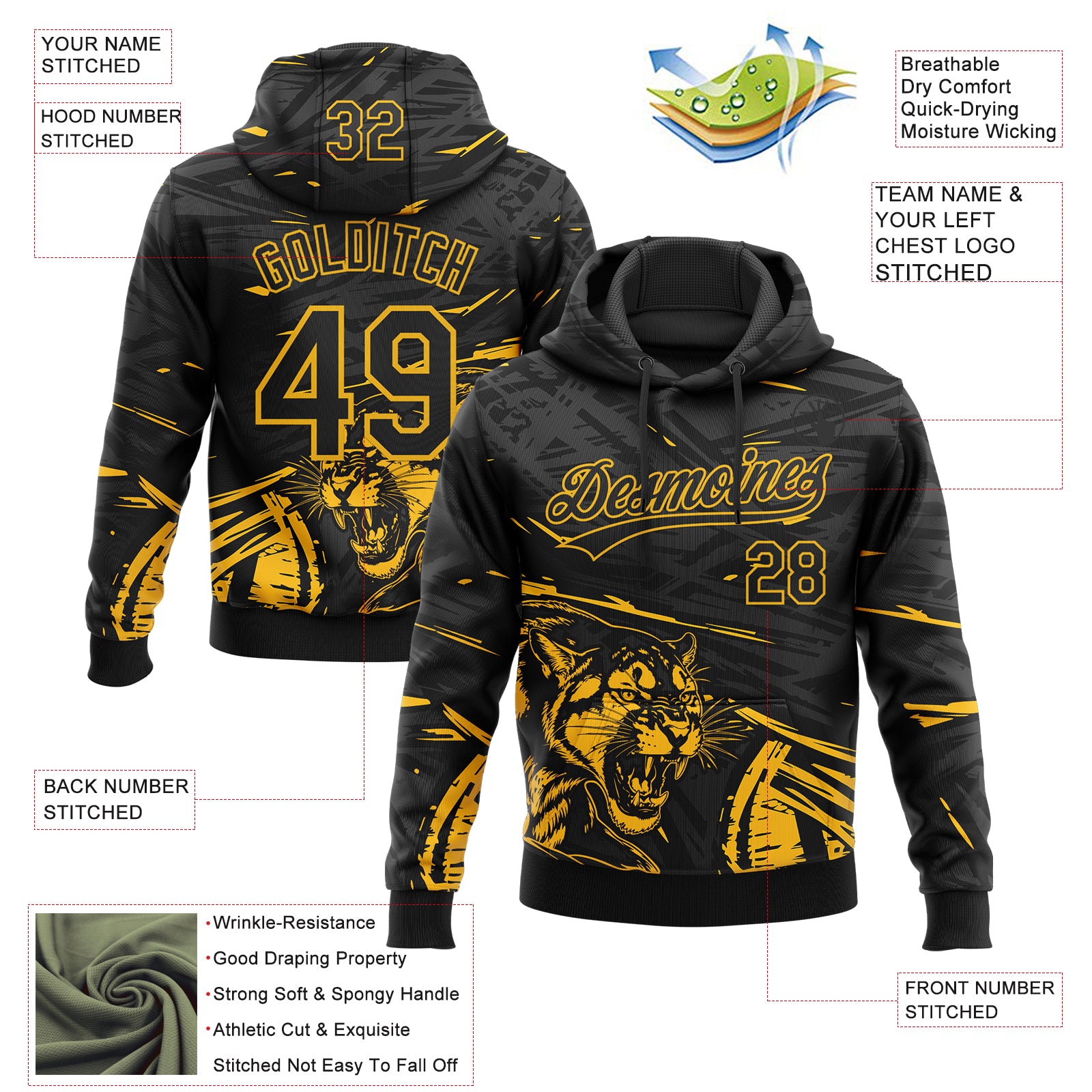 Custom Stitched Black Gold-Gray 3D Pattern Design Animal Tiger Sports Pullover Sweatshirt Hoodie