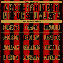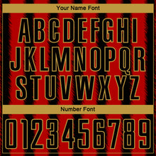 • Load image into Gallery viewer, Custom Black Red-Old Gold Line Sublimation Soccer Uniform Jersey