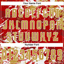 • Load image into Gallery viewer, Custom Red Old Gold-White Fluid Art Splash Sublimation Soccer Uniform Jersey