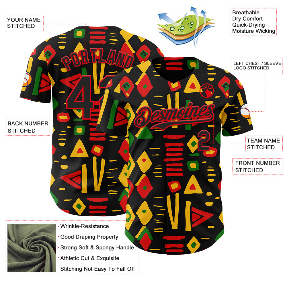 Custom Black Fire Red Green-Yellow 3D Pattern Design Black History Month African Ethnicity Style Abstract Geometric Authentic Baseball Jersey