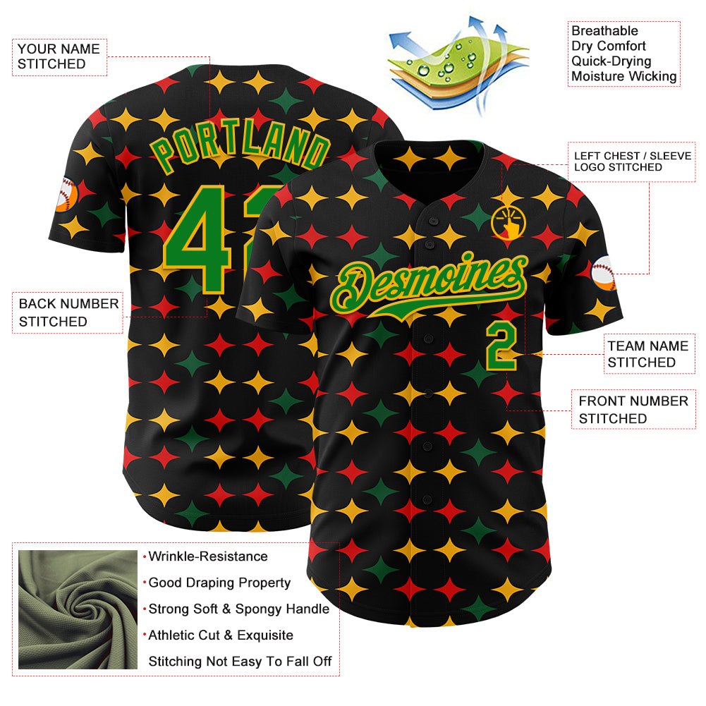 Custom Black Grass Green Gold-Red 3D Pattern Design Black History Month African Ethnicity Style Abstract Geometric Authentic Baseball Jersey