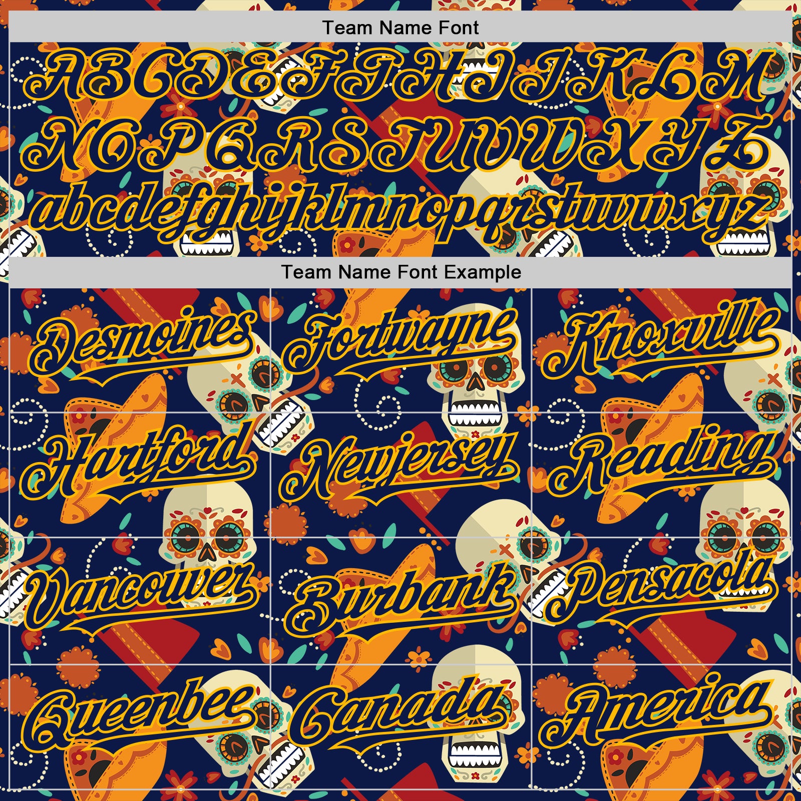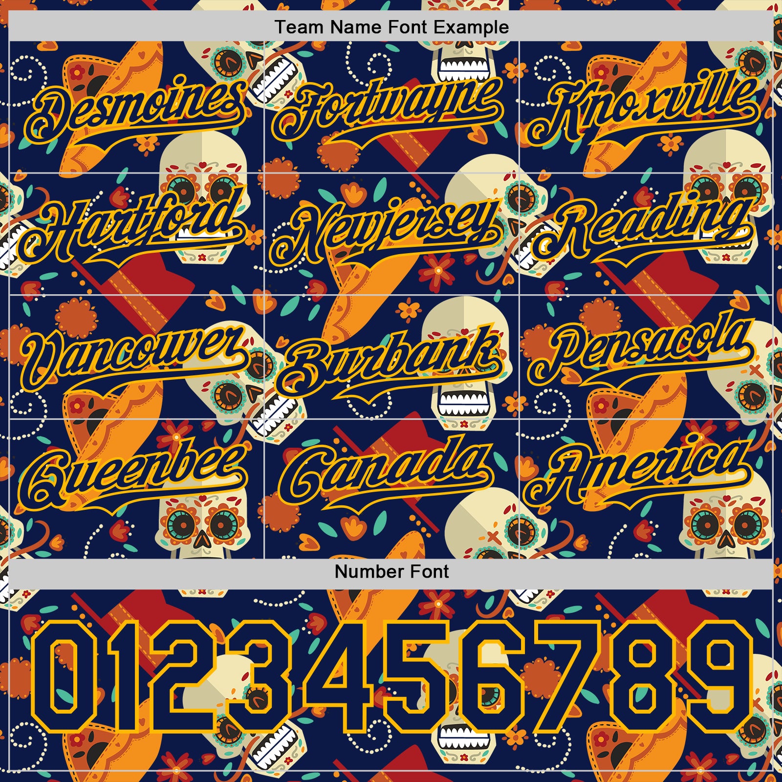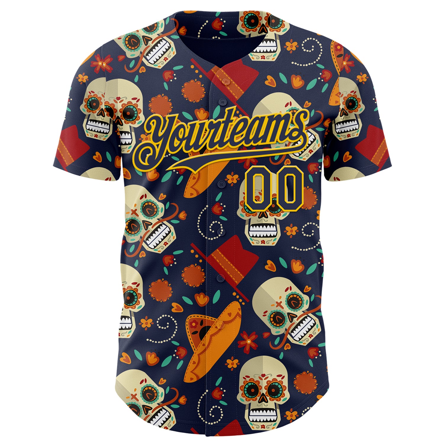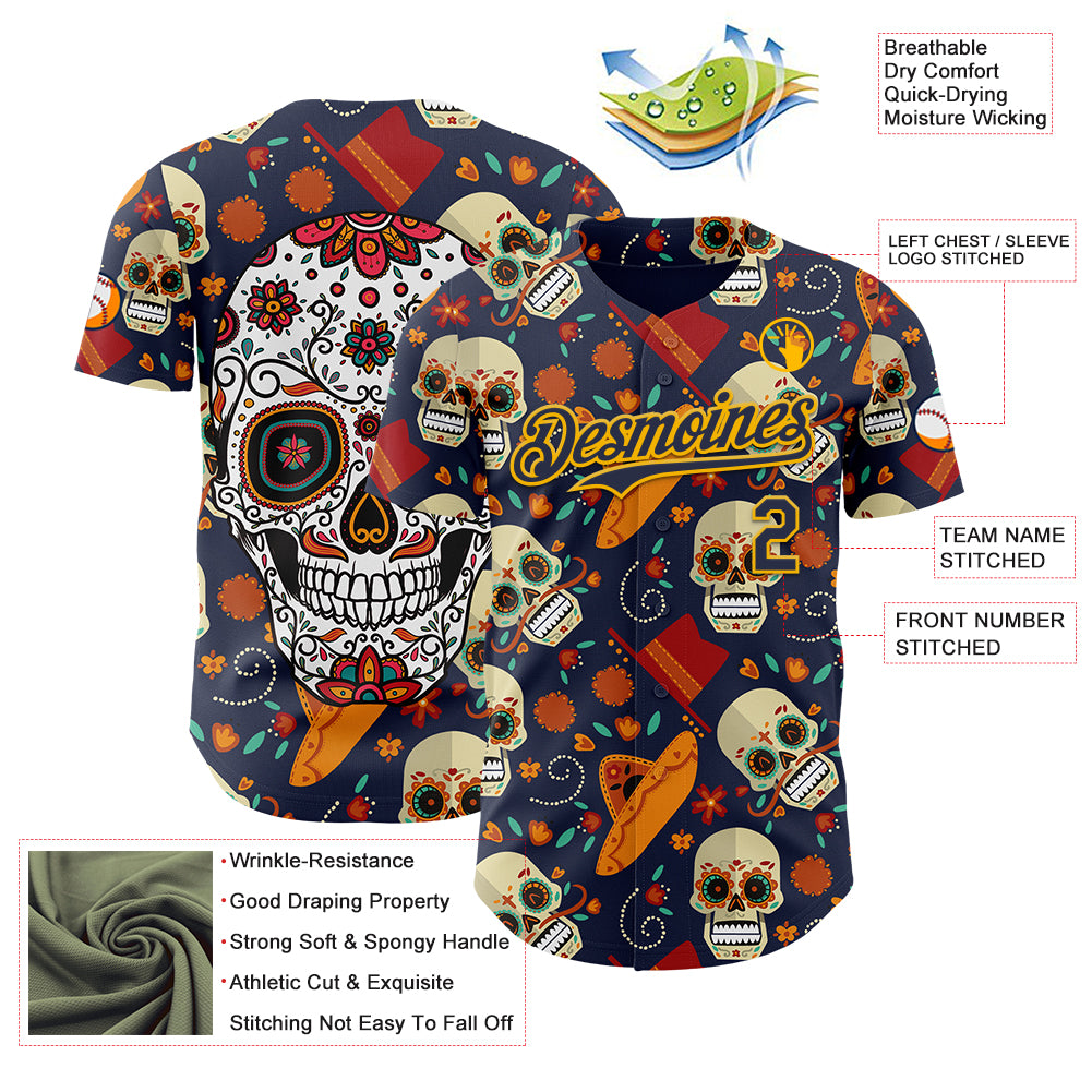 Custom Navy Gold Sugar Skull Day of the Dead Mexican Folk Art Authentic Baseball Jersey