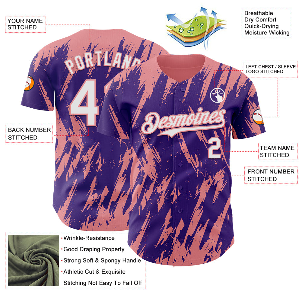 Custom Purple White-Medium Pink 3D Pattern Design Splatter Torn Sharp Brush Stroke Authentic Baseball Jersey