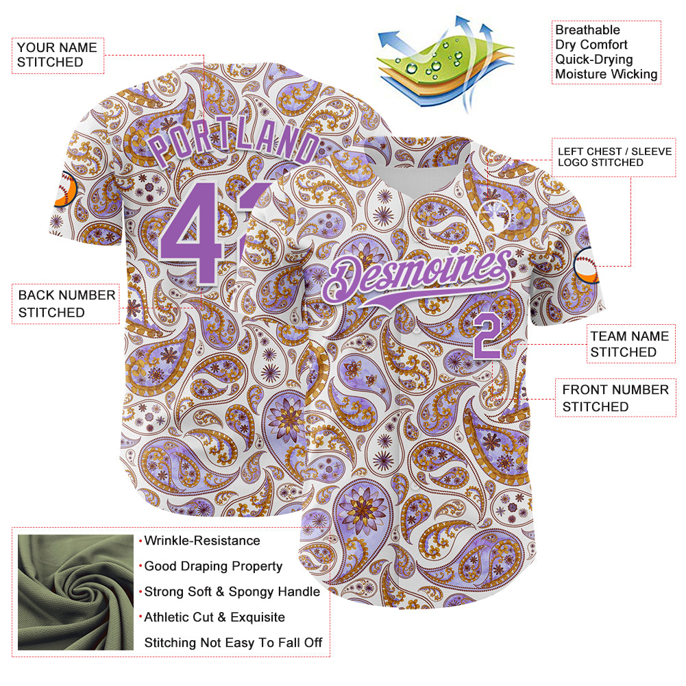 Custom White Medium Purple 3D Pattern Design Rave Party Ethnic Paisley Bandana Authentic Baseball Jersey