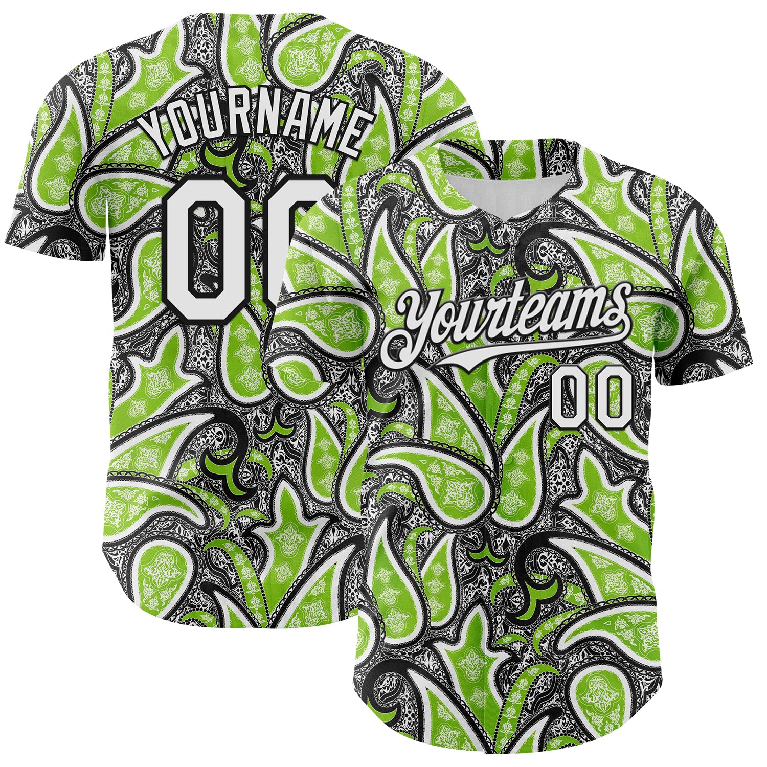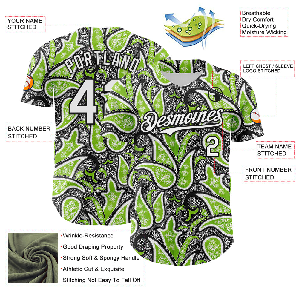 Custom Black White-Neon Green 3D Pattern Design Rave Party Ethnic Paisley Bandana Authentic Baseball Jersey