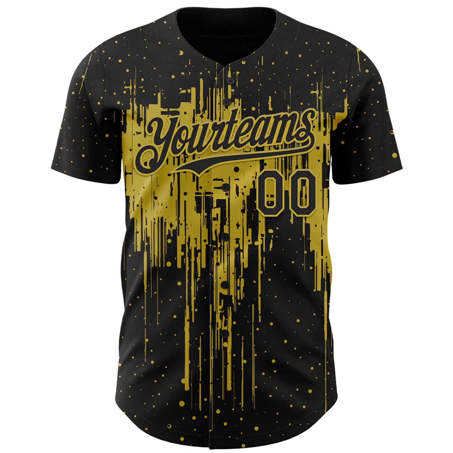 Custom Black Old Gold 3D Pattern Design Dripping Splatter Paint Authentic Baseball Jersey