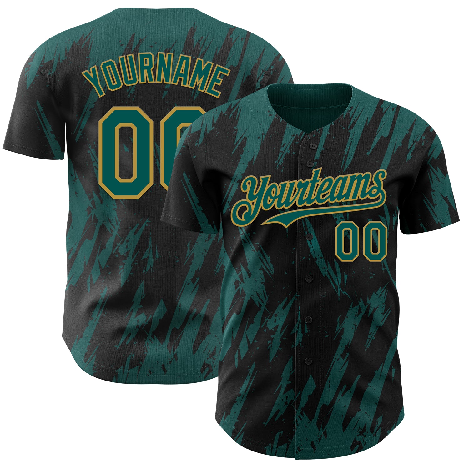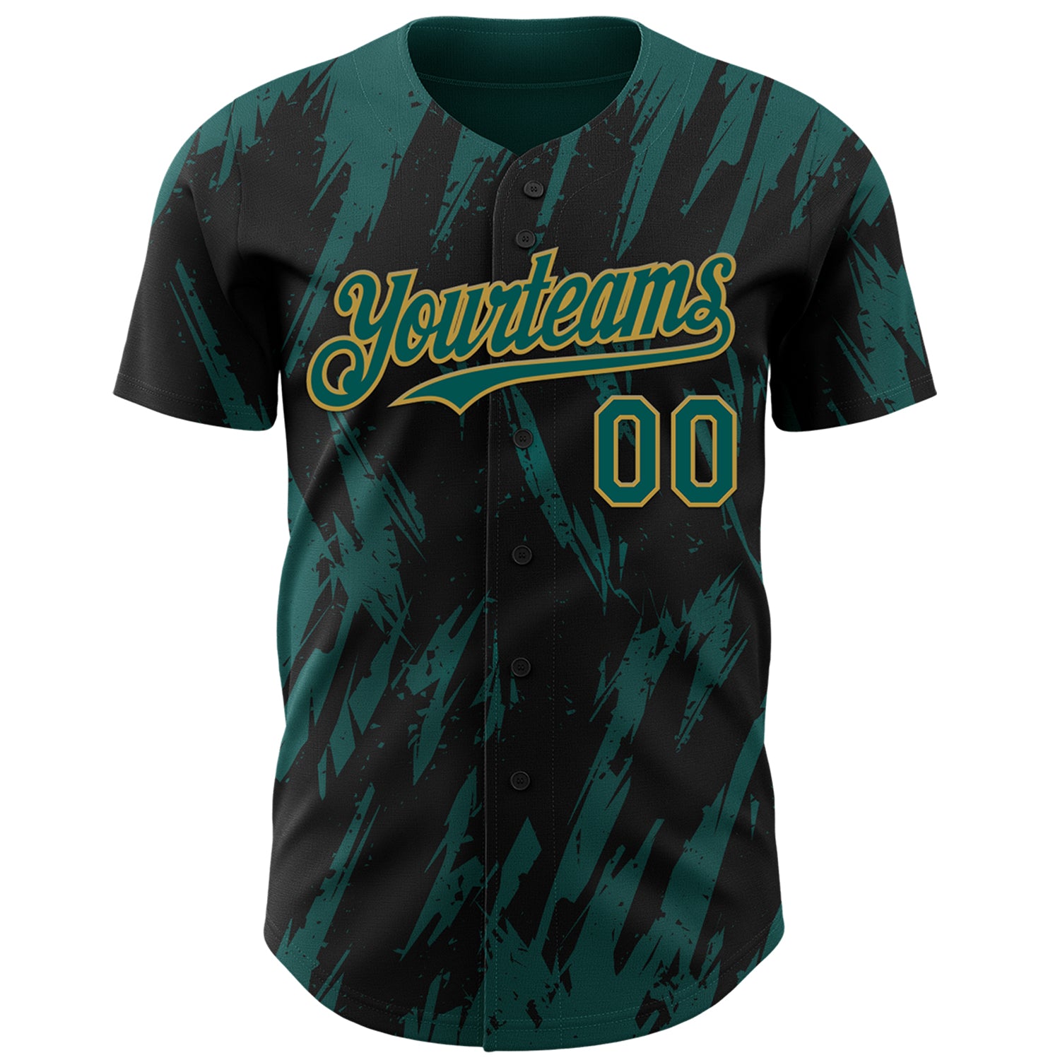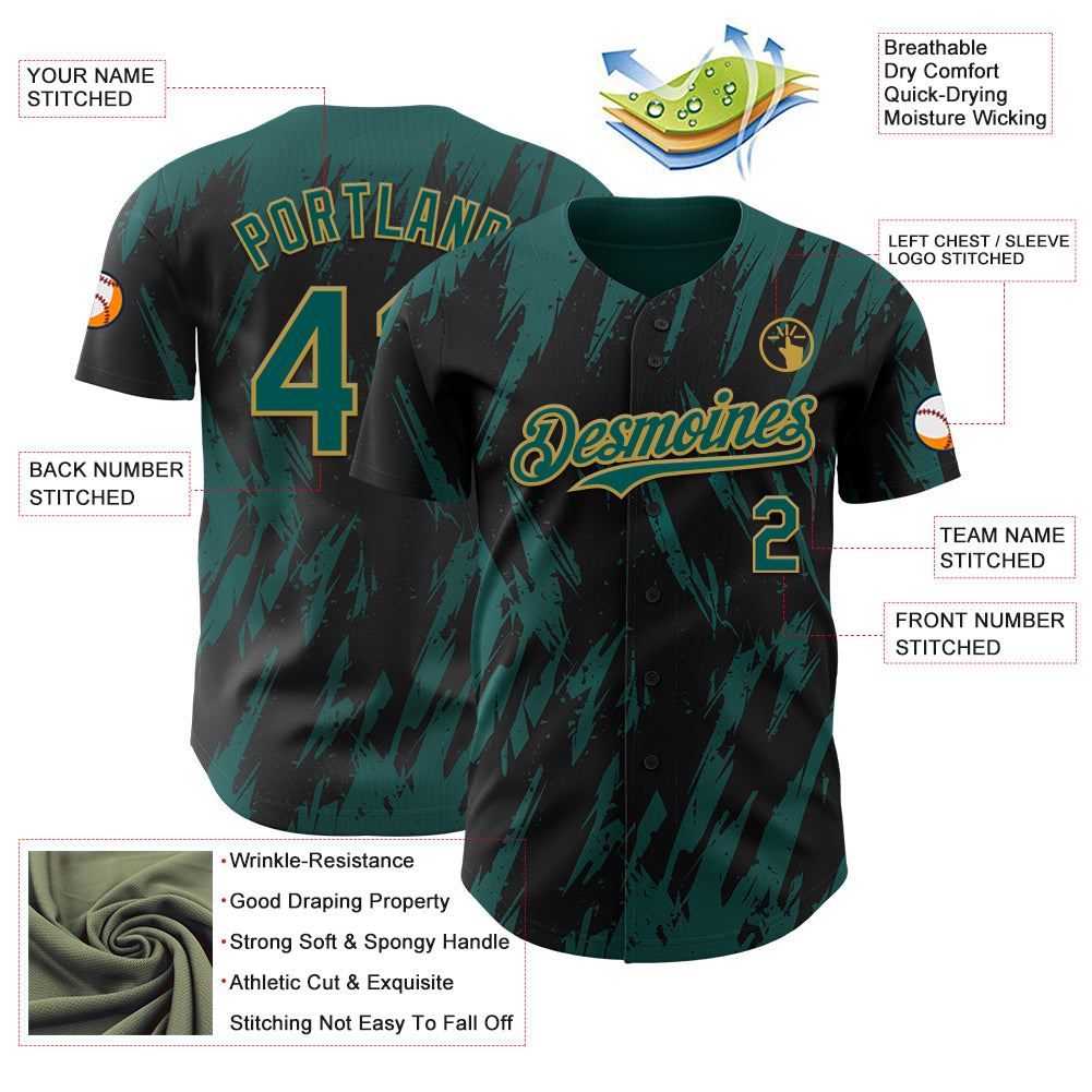 Custom Black Midnight Green-Old Gold 3D Pattern Design Splatter Torn Sharp Brush Stroke Authentic Baseball Jersey