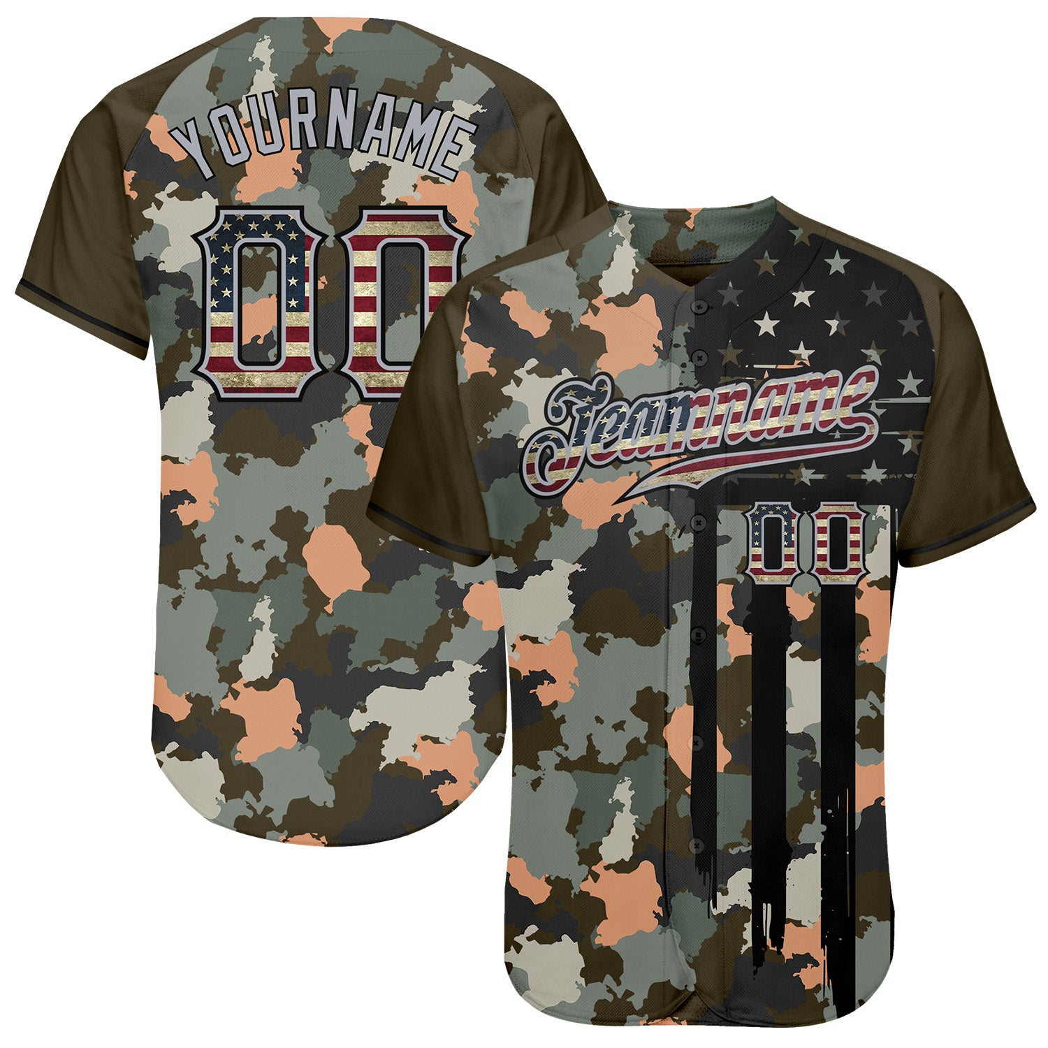 Custom Camo Vintage USA Flag Olive Gray-Black Patriotic Raglan Sleeves Authentic Baseball Jersey