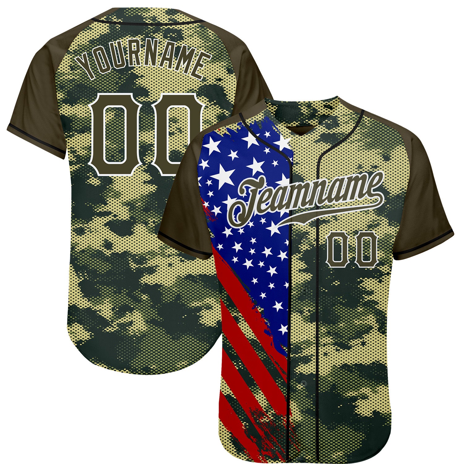 Custom Camo Olive Red Blue Black-White American Flag Side Stripe Patriotic Digital Woodland Camouflage Raglan Sleeves Authentic Baseball Jersey