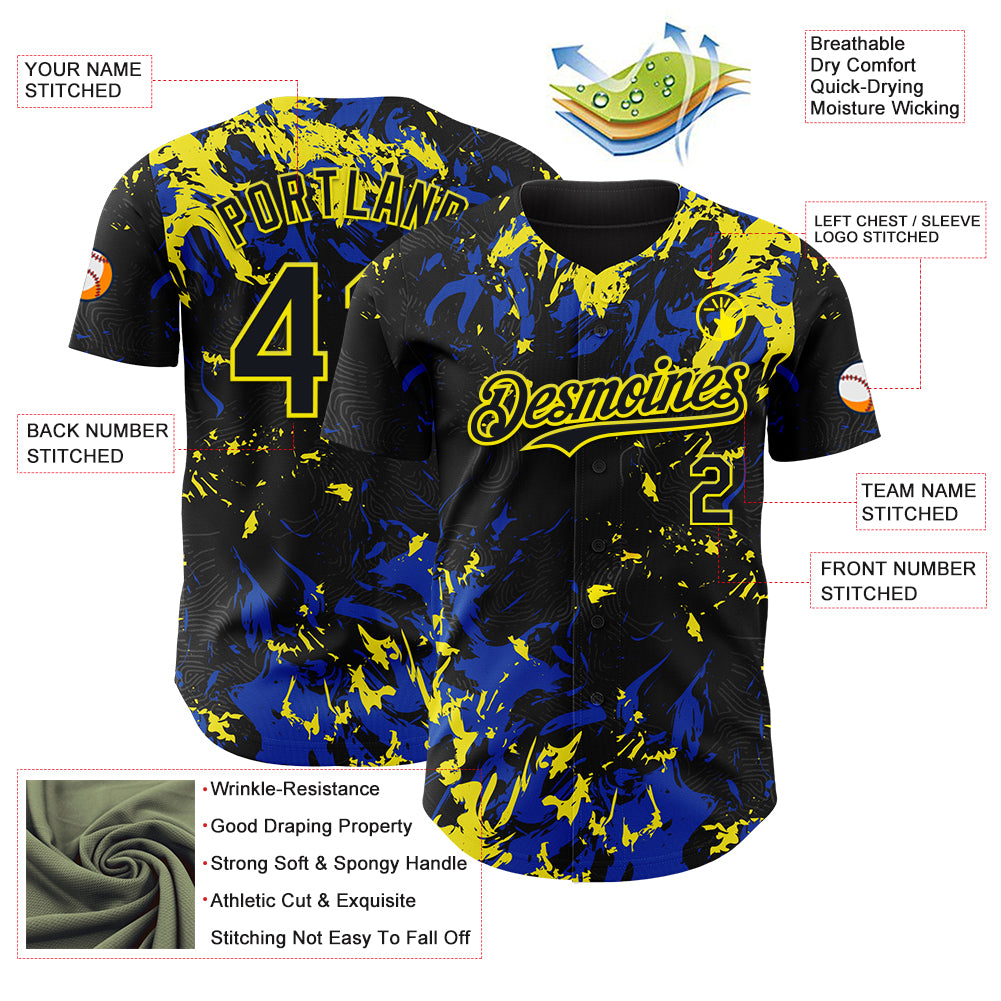 Custom Black Thunder Blue-Light Yellow 3D Pattern Design Splash Authentic Baseball Jersey