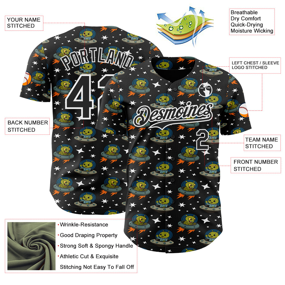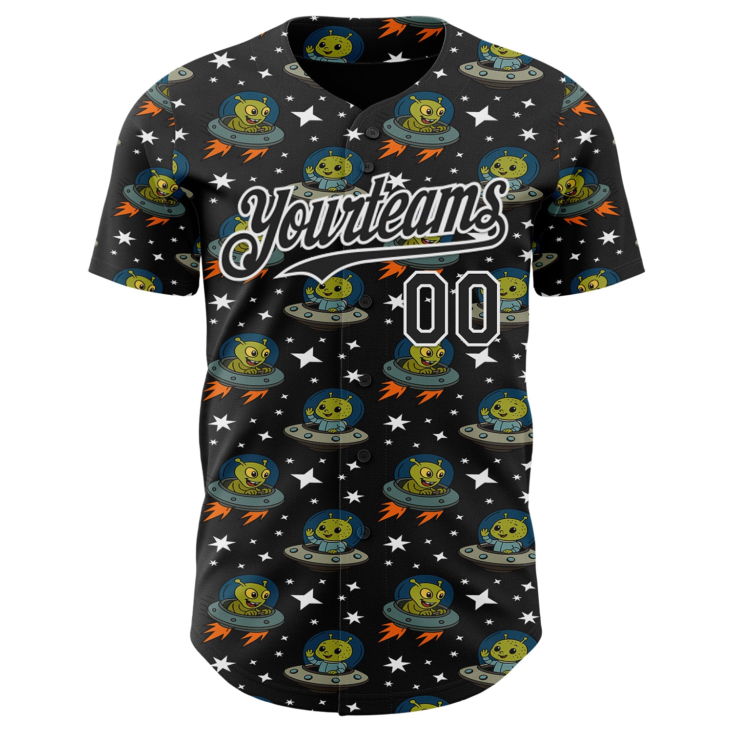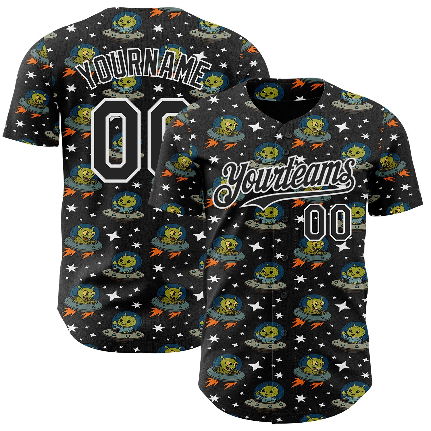 Custom Black White 3D Pattern Design Cartoon Alien UFO Space Galaxy Authentic Baseball Jersey